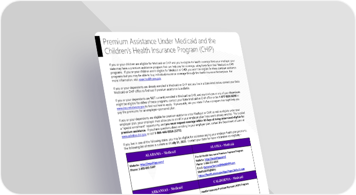 Page 9 | DePauw University | Plan Year 2026 This Compliance Overview is not intended to be exhaustive nor should any discussion or opinions be construed as legal advice. Readers should contact legal counsel for legal advice. If you or your children are eligible for Medicaid or CHIP and you’re eligible for health coverage from your employer, your state may have a premium assistance program that can help pay for coverage, using funds from their Medicaid or CHIP programs. If you or your children aren’t eligible for Medicaid or CHIP, you won’t be eligible for these premium assistance programs but you may be able to buy individual insurance coverage through the Health Insurance Marketplace. For more information, visit www.healthcare.gov. If you or your dependents are already enrolled in Medicaid or CHIP and you live in a State listed below, contact your State Medicaid or CHIP office to find out if premium assistance is available. If you or your dependents are NOT currently enrolled in Medicaid or CHIP, and you think you or any of your dependents might be eligible for either of these programs, contact your State Medicaid or CHIP office or dial 1-877-KIDS NOW or www.insurekidsnow.gov to find out how to apply. If you qualify, ask your state if it has a program that might help you pay the premiums for an employer-sponsored plan. If you or your dependents are eligible for premium assistance under Medicaid or CHIP, as well as eligible under your employer plan, your employer must allow you to enroll in your employer plan if you aren’t already enrolled. This is called a “special enrollment” opportunity, and you must request coverage within 60 days of being determined eligible for premium assistance. If you have questions about enrolling in your employer plan, contact the Department of Labor at www.askebsa.dol.gov or call 1-866-444-EBSA (3272). If you live in one of the following states, you may be eligible for assistance paying your employer health plan premiums. The following list of states is current as of July 31, 2025. Contact your State for more information on eligibility – Premium Assistance Under Medicaid and the Children’s Health Insurance Program (CHIP) ALABAMA – Medicaid ALASKA – Medicaid Website: http://myalhipp.com/ Phone: 1-855-692-5447 The AK Health Insurance Premium Payment Program Website: http://myakhipp.com/ Phone: 1-866-251-4861 Email: CustomerService@MyAKHIPP.com Medicaid Eligibility: https://health.alaska.gov/dpa/Pages/default.aspx ARKANSAS – Medicaid CALIFORNIA – Medicaid Website: http://myarhipp.com/ Phone: 1-855-MyARHIPP (855-692-7447) Health Insurance Premium Payment (HIPP) Program Website: http://dhcs.ca.gov/hipp Phone: 916-445-8322 Fax: 916-440-5676 Email: hipp@dhcs.ca.gov COLORADO – Health First Colorado (Colorado’s Medicaid Program) & Child Health Plan Plus (CHP+) FLORIDA – Medicaid Health First Colorado Website: https://www.healthfirstcolorado.com/ Health First Colorado Member Contact Center: 1-800-221-3943/State Relay 711 CHP+: https://hcpf.colorado.gov/child-health-plan-plus CHP+ Customer Service: 1-800-359-1991/State Relay 711 Health Insurance Buy-In Program (HIBI): https://www.mycohibi.com/ HIBI Customer Service: 1-855-692-6442 Website: https://www.flmedicaidtplrecovery.com/flmedicaidtplrecov ery.com/hipp/index.html Phone: 1-877-357-3268