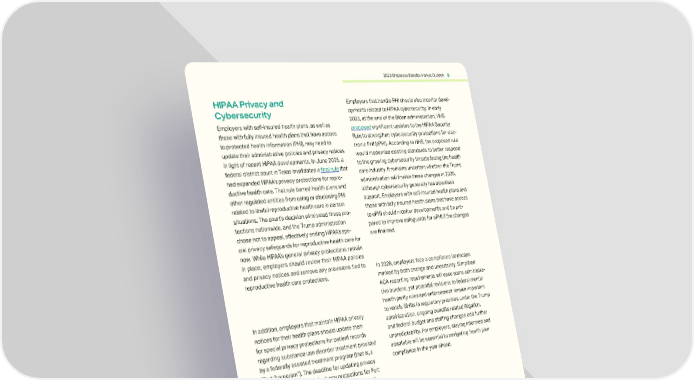 2026 Employee Benefits Market Outlook 8 HIPAA Privacy and Cybersecurity Employers with self-insured health plans, as well as those with fully insured health plans that have access to protected health information (PHI), may need to update their administrative policies and privacy notices in light of recent HIPAA developments. In June 2025, a federal district court in Texas invalidated a final rule that had expanded HIPAAs privacy protections for repro- ductive health care. That rule barred health plans and other regulated entities from using or disclosing PHI related to lawful reproductive health care in certain situations. The courts decision eliminated these pro- tections nationwide, and the Trump administration chose not to appeal, effectively ending HIPAAs spe- cial privacy safeguards for reproductive health care for now. While HIPAAs general privacy protections remain in place, employers should review their HIPAA policies and privacy notices and remove any provisions tied to reproductive health care protections. In addition, employers that maintain HIPAA privacy notices for their health plans should update them for special privacy protections for patient records regarding substance use disorder treatment provided by a federally assisted treatment program (that is, a Part 2 program). The deadline for updating privacy notices for the additional privacy protections for Part 2 program records is Feb. 16, 2026. Employers with self-insured health plans should also distribute their updated privacy notices by this deadline. Note that while self-insured health plans must maintain and pro- vide their own privacy notices, fully insured health plans are not required to maintain or provide privacy notices unless the plan sponsor has access to PHI. In that case, fully insured health plans that have access to PHI must maintain a privacy notice and provide it upon request. It is unclear if HHS will update its model notices to incorporate the new requirements before the compli- ance deadline. Employers that handle PHI should also monitor devel- opments related to HIPAA cybersecurity. In early 2025, at the end of the Biden administration, HHS proposed significant updates to the HIPAA Security Rule to strengthen cybersecurity protections for elec- tronic PHI (ePHI). According to HHS, the proposed rule would modernize existing standards to better respond to the growing cybersecurity threats facing the health care industry. It remains uncertain whether the Trump administration will finalize these changes in 2026, although cybersecurity generally has bipartisan support. Employers with self-insured health plans and those with fully insured health plans that have access to ePHI should monitor developments and be pre- pared to improve safeguards for ePHI if the changes are finalized. In 2026, employers face a compliance landscape marked by both change and uncertainty. Simplified ACA reporting requirements will ease some administra- tive burdens, yet potential revisions to federal mental health parity rules and enforcement remain important to watch. Shifts in regulatory priorities under the Trump administration, ongoing benefits related litigation, and federal budget and staffing changes add further unpredictability. For employers, staying informed and adaptable will be essential to navigating health plan compliance in the year ahead.