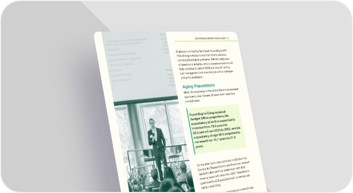 2026 Employee Benefits Market Outlook 12 Employers are feeling the impact. According to KFF, 75% of large employers said that chronic diseases contributed to higher premiums. With the rising rates of obesity and diabetes, chronic disease prevalence will likely continue to climb in 2026 and beyond, making cost management and impactful preventive strategies critical for employers. Aging Populations While life expectancy in the United States has increased significantly over the past 50 years, birth rates have trended down. According to Congressional Budget Office projections, life expectancy at birth is expected to increase from 78.9 years to 82.3 years from 2025 to 2055, and life expectancy at age 65 is projected to increase from 19.7 years to 21.8 years. On the other hand, data published in 2025 from the Centers for Disease Control and Prevention revealed that birth rates continue to decrease, with 2024 showing lower birth rates than 2023. These factors contribute to a U.S. population with an average age that is slowly rising. In general, health care costs increase as people age. The Centers for Medicare and Medicaid Services reported that per-person personal health care spending for the 65-and-older population is around five times higher than spending per child and almost 2.5 times the spending per working-age person. Despite making up a smaller percentage of the popula- tion, this category accounts for a sizable proportion of health care spending, largely driven by their likelihood of having chronic conditions. With more Americans entering retirement age, the impact of an aging popu- lation is likely to continue increasing overall health care spending.