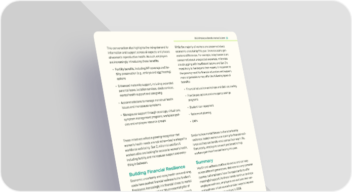 2026 Employee Benefits Market Outlook 29 This conversation also highlights the rising demand for information and support across all aspects and phases of womens reproductive health. As such, employers are increasingly introducing these benefits: Fertility benefits, including IVF coverage and fer- tility preservation (e.g., embryo and egg freezing) options Enhanced maternity support, including expanded parental leave, lactation services, doula services, mental health support and caregiving Accommodations to manage menstrual health issues and menopause symptoms Menopause support through coverage, virtual care, symptom management programs, workplace poli- cies and employee resource groups These initiatives reflect a growing recognition that womens health needs are not nichetheyre integral to workforce well-being. Gen Z, millennial and Gen X workers alike are looking for access to womens health, including fertility and menopause support and every- thing in between. Building Financial Resilience Economic uncertainty and rising health care and living costs have pushed financial wellness to the forefront. Employees increasingly link financial stress to mental health challenges, making this an essential pillar of workplace well-being. Moreover, Vanguard research found that nearly 75% of Americans fell short of their saving and spending resolutions in 2025. However, theyre ready to recommit in 2026 and are optimistic about it. As such, 84% of Americans have a financial resolution for 2026, with building an emergency fund and using a high-yielding account for short-term sav- ings goals as the top two resolutions. While the majority of workers are concerned about economic uncertainty this year, there are some gen- erational differences. For example, baby boomers are concerned about unexpected expenses, millennials are struggling with insufficient income and Gen Z is most likely to live beyond their means. In response to the growing need for financial education and support, more organizations may offer the following types of benefits: Financial education workshops and debt counseling Flexible pay options and emergency savings programs Student loan repayment Retirement planning EAPs Similar to how mental fitness is characterized by resilience, todays workers are looking for financial resil- ience so they can handle what comes their way in life. Fortunately, employers are well-positioned to help workers gain their financial footing this year. Summary Health and wellness continue to evolve and can vary across different generations. Wellness is a very personal journey, but employers have the opportunity to offer meaningful support. As these trends continue to shape employee wellness, employers can evaluate their cur- rent wellness initiatives and consider ways to improve them to better support workers in 2026.