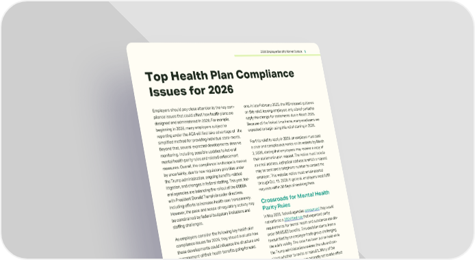 2026 Employee Benefits Market Outlook 5 Top Health Plan Compliance Issues for 2026 Employers should pay close attention to the key com- pliance issues that could affect how health plans are designed and administered in 2026. For example, beginning in 2026, many employers subject to reporting under the ACA will first take advantage of the simplified method for providing individual state-ments. Beyond that, several expected developments deserve monitoring, including possible updates to fed-eral mental health parity rules and related enforcement measures. Overall, the compliance landscape is marked by uncertainty, due to new regulatory priorities under the Trump administration, ongoing benefits-related litigation, and changes in federal staffing. This year, fed- eral agencies are balancing the rollout of the OBBBA with President Donald Trumps broader directives, including efforts to increase health care transparency. However, the pace and scope of regulatory activity may be constrained by federal budgetary limitations and staffing challenges. As employers consider the following key health plan compliance issues for 2026, they should evaluate how these developments could influence the structure and management of their health benefits going forward. Simplified ACA Reporting At the end of 2024, Congress passed legislation that eased ACA reporting requirements for employers. The ACA requires applicable large employers (ALEs) and non-ALEs with self-insured health plans to provide information to the IRS about the health plan coverage they offer (or do not offer) to their employees while providing related statements to individuals. Yet, with the new legislation, employers that take certain steps no longer need to automatically distribute these individual statements, unless an individual specifically requests one. In late February 2025, the IRS released guidance on this relief, leaving employers only a brief period to apply the change for statements due in March 2025. Because of the limited time frame, many employers are expected to begin using this relief starting in 2026. For this relief to apply in 2026, an employer must post a clear and conspicuous notice on its website by March 2, 2026, stating that employees may receive a copy of their statement upon request. The notice must include an email address, a physical address to which a request may be sent and a telephone number to contact the employer. This website notice must remain posted through Oct. 15, 2026. In general, employers must fulfill requests within 30 days of receiving them. Crossroads for Mental Health Parity Rules In May 2025, federal agencies announced they would not enforce a 2024 final rule that expanded parity requirements for mental health and substance use dis- order (MH/SUD) benefits. This decision stems from a lawsuit filed by an employer trade group challenging the rules validity. The case has been put on hold while the Trump administration reviews the rule and con- siders whether to revise or repeal it. Many of the final rules provisions were originally set to take effect in 2026. At the same time, the Trump administra- tion is taking a broader look at its overall approach to enforcing mental health parity. The Mental Health Parity and Addiction Equity Act (MHPAEA) requires parity between a group health plans medical/surgical (M/S) benefits and MH/SUD benefits. Notably, MHPAEA requires health plans and health insurance issuers to conduct comparative