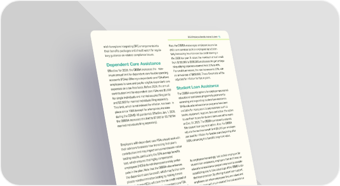 2026 Employee Benefits Market Outlook 15 wish to explore integrating DPC arrangements into their benefits packages and should watch for regula- tory guidance on related compliance issues. Dependent Care Assistance Effective for 2026, the OBBBA increases the max- imum annual limit for dependent care flexible spending accounts (FSAs). Offering a dependent care FSA allows employees to save and pay for eligible dependent care expenses on a tax-free basis. Before 2026, the annual contribution limit for dependent care FSAs was $5,000 for single individuals and married couples filing jointly and $2,500 for married individuals filing separately. This limit, which is not indexed for inflation, has been in place since 1986 (except for a temporary increase during the COVID-19 pandemic). Effective Jan. 1, 2026, the OBBBA increases this limit to $7,500 (or $3,750 for married individuals filing separately). Employers with dependent care FSAs should work with their advisors to assess how increasing their plans contribution limit may impact annual nondiscrimi-nation testing results, particularly the 55% average benefits test, which ensures that highly compensated employees (HCEs) do not disproportionately partici- pate in the plan. Note that the OBBBA also enhances the dependent care tax credit, which may further com- plicate nondiscrimination testing by making it more likely that non-HCEs will claim the tax credit instead of participating in their employer s dependent care FSA. There are steps an employer can take if it is concerned about failing nondiscrimination testing, such as limiting contribution elections for HCEs. Also, employers with dependent care FSAs should review the written plan document to determine if updates are necessary due to the increased limit and communicate the new limit to employees. Also, the OBBBA encourages employers to provide child care services to their employees by substan- tially increasing the child care tax credit starting in the 2026 tax year. It raises the maximum annual credit from $150,000 to $500,000 and boosts the percentage of qualifying expenses covered from 25% to 40%. For small businesses, the rate increases to 50%, with an annual cap of $600,000. These thresholds will be adjusted for inflation for future years. Student Loan Assistance The OBBBA expands options for employer-sponsored educational assistance programs by permanently extending and expanding student loan assistance. While educational assistance programs have been available for many years to pay expenses such as books, equipment, supplies, fees and tuition, the option to use them to pay for student loans was set to expire on Dec. 31, 2025. The OBBBA permanently extends this student loan payment option. Also, the OBBBA adjusts the tax-free benefit limit ($5,250 per employee per year) for inflation for taxable years beginning after 2026, enhancing this benefits long-term value. As employees increasingly look to their employers for student loan assistance, employers that dont have an educational assistance program may want to consider establishing one to take advantage of the OBBBAs stu- dent loan provision. By offering student loan support, employers can show employees they are valued and provide them with much-needed financial assistance and support.