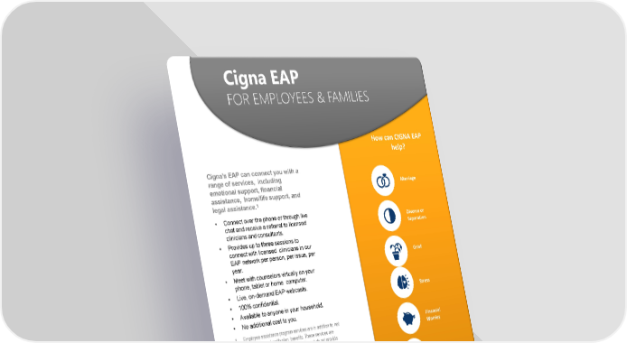 Page 11 | Inotiv | Plan Year 2026 This booklet provides only a summary of your benefits. All services described within are subject to the definitions, limitations, and exclusions set forth in each insurance carrier or provider’s contract. Cigna’s EAP can connect you with a range of services, including emotional support, financial assistance, home/life support, and legal assistance.1 • Connect over the phone or through live chat and receive a referral to licensed clinicians and consultants. • Provides up to three sessions to connect with licensed clinicians in our EAP network per person, per issue, per year. • Meet with counselors virtually on your phone, tablet or home computer. • Live, on-demand EAP webcasts. • 100% confidential. • Available to anyone in your household. • No additional cost to you. 1. Employee assistance program services are in addition to, not instead of, your health plan benefits. These services are separate from your health plan benefits and do not provide reimbursement for financial losses. Customers are required to pay the entire discounted charge for any discounted legal and/or financial services. Legal consultations related to employment matters are excluded. Additional restrictions may apply. Program availability may vary by plan type and location and are not available where prohibited bylaw. (877) 622-4327 Cigna EAP FOR EMPLOYEES & FAMILIES Divorce or Separation Marriage Stress Grief Alcohol/Drug Problems Financial Worries Communication Problems Child/Adolescent Issues How can CIGNA EAP help?