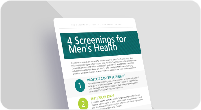 L H D B E N E F I T S B E S T P R A C T I C E S F O R P R E V E N T I V E C A R E 4 Screenings for Men’s Health Preventive screenings are essential for men because they detect health issues early, often before symptoms appear, when they are most treatable. Routine checkups like blood pressure, cholesterol, prostate, and colon cancer screenings, along with dental and eye exams, help reduce the risk of serious illness and identify other underlying health concerns. Staying proactive with preventive care supports better overall health and helps avoid complications. PROSTATE CANCER SCREENING A prostate cancer screening uses a PSA blood test, sometimes with a digital rectal exam, to help detect cancer early when treatment is most effective. Men should talk with their doctor about when to begin screening, often around age 50 or earlier if they have higher risk. TESTICULAR EXAM A testicular exam is a simple check for lumps, swelling, or other changes that may indicate cancer or other conditions early, when treatment is most effective. Men should perform regular self exams and discuss any concerns with their doctor during routine checkups. COLORECTAL CANCER SCREENING A colorectal exam checks for cancer or precancerous changes early, when treatment is most effective. Adults should begin screening around age 45 or earlier based on risk. SKIN EXAM A skin exam checks for unusual moles or changes that may indicate skin cancer early. Adults should begin regular self checks in early adulthood and include skin exams as part of routine checkups. 401 Pennsylvania Pkwy Suite 200 Indianapolis, IN 46280 LHDbenefits.com Office: Population Health: PopulationHealth@lhdbenefits.com