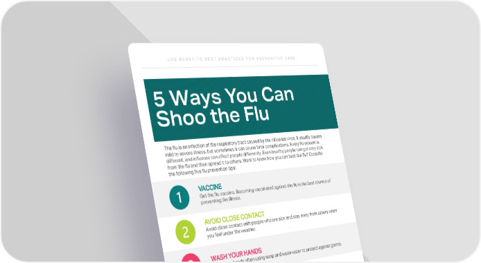L H D B E N E F I T S B E S T P R A C T I C E S F O R P R E V E N T I V E C A R E 5 Ways You Can Shoo the Flu The flu is an infection of the respiratory tract caused by the influenza virus. It usually causes mild to severe illness, but sometimes it can cause fatal complications. Every flu season is different, and influenza can affect people differently. Even healthy people can get very sick from the flu and then spread it to others. Want to know how you can beat the flu? Consider the following five flu prevention tips: VACCINE Get the flu vaccine. Becoming vaccinated against the flu is the best chance of preventing the illness. AVOID CLOSE CONTACT Avoid close contact with people who are sick and stay away from others when you feel under the weather. WASH YOUR HANDS Wash your hands often using soap and warm water to protect against germs. QUALITY SLEEP Get plenty of sleep, stay physically active and drink plenty of water to keep your immune system strong. MANAGE STRESS Manage your stress and eat a nutritious diet rich in healthy grains, fruits, vegetables and fiber. 401 Pennsylvania Pkwy Suite 200 Indianapolis, IN 46280 LHDbenefits.com Office: Population Health: [email protected]