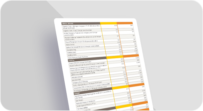 MEDICAL SERVICES What’s covered Diagnostic Exam - Arteriogram, Angiogram, CT, CAT, EKG, EEG, or MRI (1 $100 $200 time per benefit year) Diagnostic Exam - X-ray (1 time per covered accident) $25 $30 Accident Emergency Treatment, non-emergency room (once per $25 $50 covered accident) Physician's Follow-up Treatment office visit (per visit, up to 6 times per $25 $25 covered accident) Physical Therapy (per visit up to 10 visits per covered accident) $25 $25 Medical Devices $100 $125 Epidural Pain Management (up to 2 times per covered accident) $25 $50 Prescription drug $15 $25 Prosthesis (one) $250 $500 Prosthesis (two) $500 $1,000 Blood, Plasma, or Platelet Transfusion $100 $200 HOSPITAL Hospital Admission (once per benefit year) $500 $1,000 Hospital Confinement (per day up to 365 days per covered accident) $150 $250 Intensive Care Unit Admission (once per Benefit Year; payable instead of $750 $1,500 Hospital Admission benefit if Confined immediately to ICU) Intensive Care Unit Confinement (per day up to 15 days, payable in $300 $500 addition to any Hospital Confinement benefit) Ambulance (Ground) $100 $200 Ambulance (Air) $750 $1,500 Emergency Room Admission $100 $150 Family Lodging (per day up to 30 days per benefit year) $50 $100 Transportation (100 or more miles up to 3 times per covered accident) $250 $500 Rehabilitation Unit (per day up to 30 days per covered accident) $50 $100 SURGERY Miscellaneous Surgery requiring general anesthesia (not covered by any $150 $300 other benefit) Open Surgery $625 $1,250 Exploratory Surgery or Debridement $125 $250 Tendon/Ligament/Rotator Cuff Tear $300 $625 Torn Knee Cartilage $300 $625 Ruptured/Herniated Disc $300 $625 EMERGENCY DENTAL Emergency Dental extraction $30 $65 Emergency Dental crown $100 $200 WELLNESS Wellness Screening Benefit $50 $50 (once per benefit year) LIFE AND DISMEMBERMENT LOSSES* LOW PLAN HIGH PLAN Accidental Death $15,000 $25,000 Accidental Death Common Carrier (pays an additional benefit if accidental death occurs while traveling as a fare- $30,000 $100,000 paying passenger on a public conveyance) Catastrophic Loss: Both arms or both hands, both legs or both feet, one hand and one foot or one arm and one leg, $7,500 $15,000 or irrecoverable loss of sight of both eyes Loss of one hand, foot, leg, or arm $3,750 $7,500 Loss of sight of one eye or loss of one eye $3,750 $7,500 Two or more fingers or toes $750 $1,500 One finger or one toe $375 $750 800-247-6875 • sunlife.com/us Accident Insurance