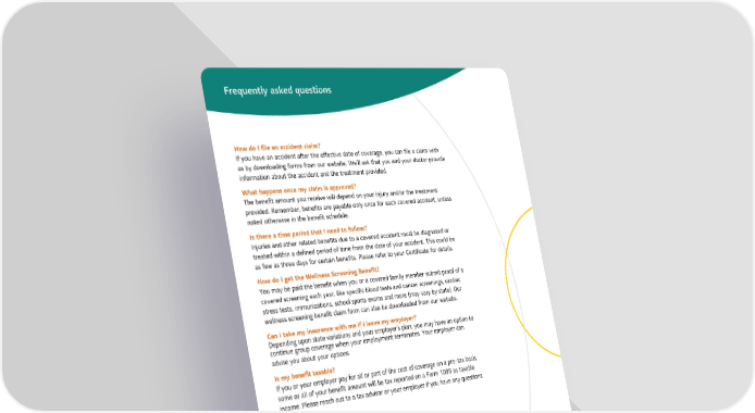 Frequently asked questions How do I file an accident claim? If you have an accident after the effective date of coverage, you can file a claim with us by downloading forms from our website. We’ll ask that you and your doctor provide information about the accident and the treatment provided. What happens once my claim is approved? The benefit amount you receive will depend on your injury and/or the treatment provided. Remember, benefits are payable only once for each covered accident, unless noted otherwise in the benefit schedule. Is there a time period that I need to follow? Injuries and other related benefits due to a covered accident must be diagnosed or treated within a defined period of time from the date of your accident. This could be as few as three days for certain benefits. Please refer to your Certificate for details. How do I get the Wellness Screening Benefit? You may be paid the benefit when you or a covered family member submit proof of a covered screening each year, like specific blood tests and cancer screenings, cardiac stress tests, immunizations, school sports exams and more (may vary by state). Our wellness screening benefit claim form can also be downloaded from our website. Can I take my insurance with me if I leave my employer? Depending upon state variations and your employer’s plan, you may have an option to continue group coverage when your employment terminates. Your employer can advise you about your options. Is my benefit taxable? If you or your employer pay for all or part of the cost of coverage on a pre-tax basis, some or all of your benefit amount will be tax reported on a Form 1099 as taxable income. Please reach out to a tax advisor or your employer if you have any questions. Accident insurance is a limited bene昀椀t policy. The Certi昀椀cate has exclusions that may affect any bene昀椀ts payable. Bene昀椀ts payable are subject to all terms and conditions of your Certi昀椀cate. 1. “Health, United States, 2016,” US Department of Health and Human Services, Table 75. Read the Important information section for more details including limitations and exclusions. 800-247-6875 • sunlife.com/us Acccident Insurance