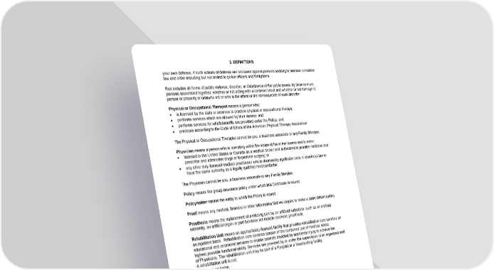 2. DEFINITIONS your own defense, if such actions of defense are not taken against persons seeking to maintain or restore law and order including but not limited to police officers and firefighters. Riot includes all forms of public violence, disorder, or disturbance of the public peace, by three or more persons assembled together, whether or not acting with a common intent and whether or not damage to person or property or unlawful act or acts is the intent or the consequence of such disorder. Physical or Occupational Therapist means a person who: · is licensed by the state or province to practice physical or occupational therapy; · performs services which are allowed by their license; and · performs services for which benefits are provided under the Policy; and · practices according to the Code of Ethics of the American Physical Therapy Association. The Physical or Occupational Therapist cannot be you, a business associate or any Family Member. Physician means a person who is operating within the scope of his or her license and is either: · licensed in the United States or Canada as a medical doctor and authorized to practice medicine and prescribe and administer drugs or to perform surgery; or · any other duly licensed medical practitioner who is deemed by applicable state or provincial law to have the same authority as a legally qualified medical doctor. The Physician cannot be you, a business associate or any Family Member. Policy means the group insurance policy under which this Certificate is issued. Policyholder means the entity to which the Policy is issued. Proof means any medical, financial or other information that we require to make a claim determination. Prosthesis means the replacement of a missing part by an artificial substitute, such as an artificial extremity, an artificial organ or part but does not include cosmetic prosthesis. Rehabilitation Unit means an appropriately licensed facility that provides rehabilitation care services on an inpatient basis. Rehabilitation care services consist of the combined use of medical, social, educational and vocational services to enable patients disabled by accidental Injury to achieve the highest possible functional ability. Services are provided by or under the supervision of an organized staff of Physicians. The rehabilitation unit may be part of a Hospital or a freestanding facility. A rehabilitation unit is not: · a nursing home; · an extended care facility; · a skilled nursing facility; · a rest home or home for the aged; · a hospice care facility; · a place for alcoholics or drug addicts; or · an assisted living facility. Sickness means disease or illness, mental illness, drug illness, abuse or addiction, and alcohol illness, abuse or addiction, or pregnancy. Signed means any symbol or method executed or adopted by a person with the present intention to authenticate a record, and which is on or transmitted by paper, electronic or telephonic media, and which is consistent with applicable law. Spouse means any person who is a party to a marriage and under state, federal or provincial law is recognized as a spouse or civil union partner. Spouse does not include: 16-AC-C-01 Page14