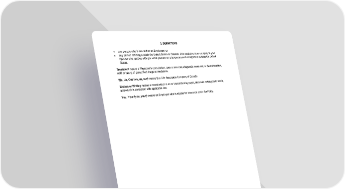2. DEFINITIONS · any person who is insured as an Employee; or · any person residing outside the United States or Canada. This exclusion does not apply to your Spouse who resides with you while you are on a temporary work assignment outside the United States. Treatment means a Physician's consultation, care or services; diagnostic measures; or the prescription, refill or taking of prescribed drugs or medicines. We, Us, Our (we, us, our) means Sun Life Assurance Company of Canada. Written or Writing means a record which is on or transmitted by paper, electronic or telephonic media, and which is consistent with applicable law. You, Your (you, your) means an Employee who is eligible for insurance under the Policy. 16-AC-C-01 Page15