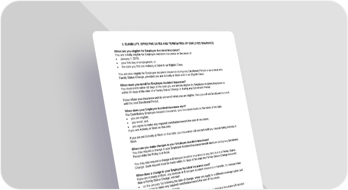 3. ELIGIBILITY, EFFECTIVE DATES AND TERMINATION OF EMPLOYEE INSURANCE When are you eligible for Employee Accident Insurance? You are initially eligible for Employee Accident Insurance on the latest of: · January 1, 2019; · your first day of employment; or · the date you first are Actively at Work in an Eligible Class. You are also eligible for Employee Accident Insurance during any Enrollment Period or as a result of a Family Status Change, provided you are Actively at Work and in an Eligible Class. When must you enroll for Employee Accident Insurance? You must enroll within 90 days of the date you are initially eligible for Employee Accident Insurance or within 31 days of the date of a Family Status Change or during any Enrollment Period. If you refuse your insurance and do not enroll when you are eligible, then you will not be allowed to enroll until the next Enrollment Period. When does your Employee Accident Insurance start? For Contributory Employee Accident Insurance, your insurance starts on the latest of the date: · you are eligible; · you enroll; and · you agree to make any required contribution toward the cost of insurance; if you are Actively at Work on that date. If you are not Actively at Work on that date, your insurance will not start until you resume being Actively at Work. When can you make changes in your Employee Accident Insurance? You may request a change in your Employee Accident Insurance benefit elections during any Enrollment Period while the Policy is in force. You may also request a change in Employee Accident Insurance at any time due to a Family Status Change. Such request must be made within 31 days of the date the Family Status Change occurred. When does a change in your Employee Accident Insurance start? If you are Actively at Work, any increase in Employee Accident Insurance or benefits, for reasons other than a Family Status Change, will start: · on the January 1st following the date of change, when you apply for a different coverage option and you agree to make any required contribution toward the cost of insurance; · on the date of the Policy change. If you are not Actively at Work on that date, any increase in Employee Accident Insurance will not start until you resume being Actively at Work. Whether or not you are Actively at Work, any reduction in Employee Accident Insurance or benefits for reasons other than a Family Status Change, will start: · on the January 1st following the date of change, when you apply for a different coverage option; · on the date of the Policy change. If you are Actively at Work, any increase in Employee Accident Insurance or benefits due to a Family Status Change will start on the latest of: · the date you apply for such change in Employee Accident Insurance and you agree to make any required contribution toward the cost of the insurance; or · the date of your Family Status Change. If you are not Actively at Work on that date, any increase due to a Family Status Change in Employee Accident Insurance or benefits will not start until you resume being Actively at Work. 16-AC-C-01 Page16