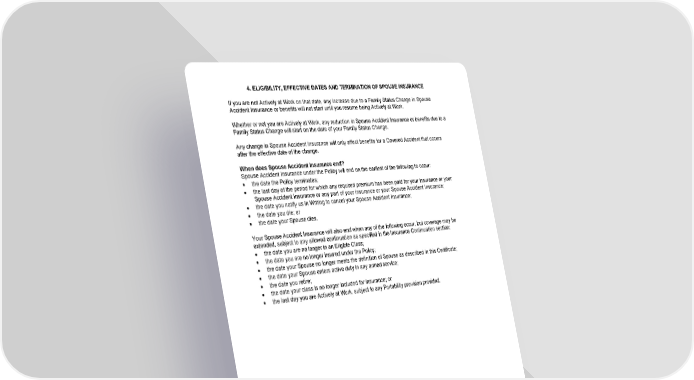 4. ELIGIBILITY, EFFECTIVE DATES AND TERMINATION OF SPOUSE INSURANCE If you are not Actively at Work on that date, any increase due to a Family Status Change in Spouse Accident Insurance or benefits will not start until you resume being Actively at Work. Whether or not you are Actively at Work, any reduction in Spouse Accident Insurance or benefits due to a Family Status Change will start on the date of your Family Status Change. Any change in Spouse Accident Insurance will only affect benefits for a Covered Accident that occurs after the effective date of the change. When does Spouse Accident Insurance end? Spouse Accident Insurance under the Policy will end on the earliest of the following to occur: · the date the Policy terminates; · the last day of the period for which any required premium has been paid for your insurance or your Spouse Accident Insurance or any part of your insurance or your Spouse Accident Insurance; · the date you notify us in Writing to cancel your Spouse Accident Insurance; · the date you die; or · the date your Spouse dies. Your Spouse Accident Insurance will also end when any of the following occur, but coverage may be extended, subject to any allowed continuation as specified in the Insurance Continuation section: · the date you are no longer in an Eligible Class; · the date you are no longer insured under the Policy; · the date your Spouse no longer meets the definition of Spouse as described in this Certificate; · the date your Spouse enters active duty in any armed service; · the date you retire; · the date your class is no longer included for insurance; or · the last day you are Actively at Work, subject to any Portability provision provided. 16-AC-C-01 Page19