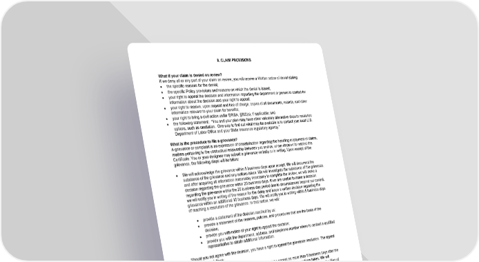 8. CLAIM PROVISIONS What if your claim is denied on review? If we deny all or any part of your claim on review, you will receive a Written notice of denial stating: · the specific reasons for the denial; · the specific Policy provisions and reasons on which the denial is based; · your right to appeal the decision and information regarding the department or person to contact for information about the decision and your right to appeal; · your right to receive, upon request and free of charge, copies of all documents, records, and other information relevant to your claim for benefits; · your right to bring a civil action under ERISA, §502(a), if applicable; and · the following statement: “You and your plan may have other voluntary alternative dispute resolution options, such as mediation. One way to find out what may be available is to contact your local U.S. Department of Labor Office and your State Insurance regulatory agency.” What is the procedure to file a grievance? A grievance or complaint is an expression of dissatisfaction regarding the handling or payment of claims, matters pertaining to the contractual relationship between you and us, or our decision to rescind this Certificate. You or your designee may submit a grievance verbally or in writing. Upon receipt of the grievance, the following steps will be taken: · We will acknowledge the grievance within 5 business days upon receipt. We will document the substance of the grievance and any actions taken. We will investigate the substance of the grievance, and after acquiring all information reasonably necessary to complete the review, we will make a decision regarding the grievance within 20 business days. If we are unable to make a decision regarding the grievance within the 20 business day period due to circumstances beyond our control, we will notify you in writing of the reason for the delay and issue a written decision regarding the grievance within an additional 10 business days. We will notify you in writing within 5 business days of reaching a resolution of the grievance. In that notice, we will: · provide a statement of the decision reached by us; · provide a statement of the reasons, policies, and procedures that are the basis of the decision; · provide you with notice of your right to appeal the decision; · provide you with the department, address, and telephone number where to contact a qualified representative to obtain additional information. Should you not agree with the decision, you have a right to appeal the grievance resolution. The appeal process is as follows: · We will issue a written or oral acknowledgment of the appeal no more than 5 business days after the appeal is filed. We will document the substance of the appeal and any actions taken. We will investigate the substance of the appeal and a decision will be made within 45 days after the filing of the appeal. We will notify you in writing within 5 business days of reaching a resolution of the appeal. In that notice, we will: · provide a statement of the disposition of the appeal; · provide a statement of the reasons, policies, and procedures that are the basis of the decision; · provide you with notice of the right to further remedies allowed by law, including the right to initiate an external grievance review by an independent review organization; · provide you with the department, address, and telephone number where to contact a qualified representative to obtain additional information. In situations where you do not agree with the decision of the appeal, you may have the right to further remedies allowed by the law, including the right to an external grievance review by an independent review organization. You will have no more than 120 days after you are notified of the appeal resolution to file a 16-AC-C-01 Page33