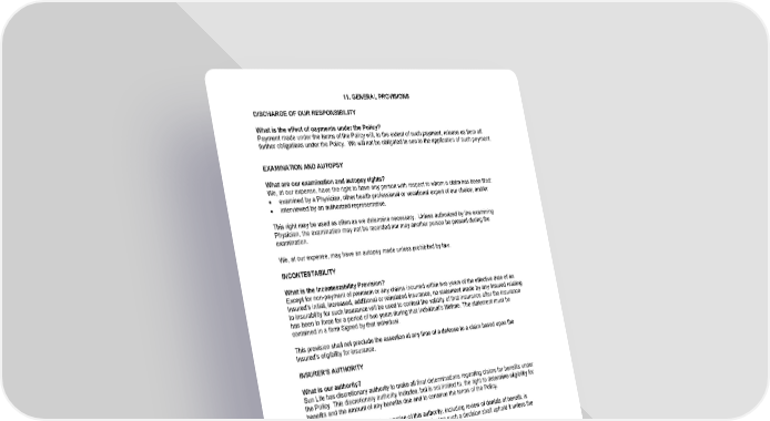11. GENERAL PROVISIONS DISCHARGE OF OUR RESPONSIBILITY What is the effect of payments under the Policy? Payment made under the terms of the Policy will, to the extent of such payment, release us from all further obligations under the Policy. We will not be obligated to see to the application of such payment. EXAMINATION AND AUTOPSY What are our examination and autopsy rights? We, at our expense, have the right to have any person with respect to whom a claim has been filed: · examined by a Physician, other health professional or vocational expert of our choice; and/or · interviewed by an authorized representative. This right may be used as often as we determine necessary. Unless authorized by the examining Physician, the examination may not be recorded nor may another person be present during the examination. We, at our expense, may have an autopsy made unless prohibited by law. INCONTESTABILITY What is the Incontestability Provision? Except for non-payment of premium or any claims incurred within two years of the effective date of an Insured’s initial, increased, additional or reinstated insurance, no statement made by any Insured relating to insurability for such insurance will be used to contest the validity of that insurance after the insurance has been in force for a period of two years during that individual’s lifetime. The statement must be contained in a form Signed by that individual. This provision shall not preclude the assertion at any time of a defense to a claim based upon the Insured’s eligibility for insurance. INSURER’S AUTHORITY What is our authority? Sun Life has discretionary authority to make all final determinations regarding claims for benefits under the Policy. This discretionary authority includes, but is not limited to, the right to determine eligibility for benefits and the amount of any benefits due and to construe the terms of the Policy. Any decision made by us in the exercise of this authority, including review of denials of benefit, is conclusive and binding on all parties. Any court reviewing such a decision shall uphold it unless the claimant proves that it was arbitrary and capricious. This provision applies only where the interpretation of this Policy is governed by the Employee Retirement Income Security Act (ERISA), 29 U.S.C. 1001 et seq. LEGAL PROCEEDINGS What are the time limits for legal proceedings? No legal action may start: · until 60 days after Proof of claim has been given; nor · more than 3 years after the time Proof of claim is required. The claimant must exhaust all internal appeal/administrative remedies prior to filing any legal proceeding. If the claimant fails to exhaust all administrative remedies prior to initiating any legal action, we shall be entitled to legal fees in defense of the action. For claims subject to ERISA, if a claimant files state law 16-AC-C-01 Page40