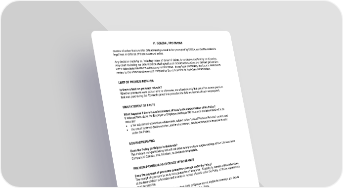 11. GENERAL PROVISIONS causes of action that are later determined by a court to be preempted by ERISA, we shall be entitled to legal fees in defense of those causes of action. Any decision made by us, including review of denial of claims, is conclusive and binding on all parties. Any court reviewing our determination shall uphold such determination unless the claimant proves Sun Life’s claim determination is without any rational basis. In any legal proceeding, the Court is limited in its review to the administrative record compiled by Sun Life prior to its final claim determination. LIMIT OF PREMIUM REFUNDS Is there a limit on premium refunds? Whether premiums were paid in error or otherwise, we will refund only that part of the excess premium that was paid during the 12-month period that preceded the date we learned of such overpayment. MISSTATEMENT OF FACTS What happens if there is a misstatement of facts in the administration of the Policy? If relevant facts about the Employer or Employee relating to this insurance are determined not to be accurate: · a fair adjustment of premium will be made, subject to the "Limit of Premium Refunds" section; and · the actual facts will decide whether, and in what amount, and for what duration insurance is valid under the Policy. NON-PARTICIPATING Does the Policy participate in dividends? The Policy is non-participating and will not share in any profits or surplus earnings of Sun Life Assurance Company of Canada, and, therefore, no dividends are payable. PREMIUM PAYMENTS AS EVIDENCE OF INSURANCE Does the payment of premiums guarantee coverage under the Policy? The receipt of premiums by us is not a guarantee of insurance. Eligibility for benefits will be determined at the time of claim submission and in order to receive a benefit under the Policy, all Policy requirements must be satisfied. If we determine that you or your Dependent Child or Spouse are not eligible for coverage, you should contact your Employer regarding the refund of premiums due, if any. REIMBURSEMENT What if a benefit is underpaid or overpaid? Reimbursement will be made to us for any overpayments that we may make due to any reason. You must repay us within 60 days unless we agree to a longer time period. Deductions may be made from future benefit payments to recover any such overpayments. If we have underpaid a benefit for any reason, we will make a lump sum payment for that amount. Interest does not accrue on any underpaid or overpaid benefit unless required under the applicable law. 16-AC-C-01 Page41