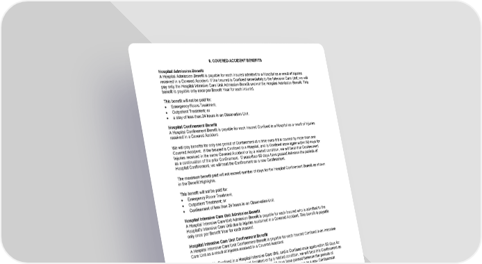 6. COVERED ACCIDENT BENEFITS Hospital Admission Benefit A Hospital Admission Benefit is payable for each Insured admitted to a Hospital as a result of Injuries received in a Covered Accident. If the Insured is Confined immediately to the Intensive Care Unit, we will pay only the Hospital Intensive Care Unit Admission Benefit and not the Hospital Admission Benefit. This benefit is payable only once per Benefit Year for each Insured. This benefit will not be paid for: · Emergency Room Treatment; · Outpatient Treatment; or · a stay of less than 24 hours in an Observation Unit. Hospital Confinement Benefit A Hospital Confinement Benefit is payable for each Insured Confined in a Hospital as a result of Injuries received in a Covered Accident. We will pay benefits for only one period of Confinement at a time even if it is caused by more than one Covered Accident. If the Insured is Confined in a Hospital, and is Confined once again within 90 days for Injuries received in the same Covered Accident or by a related condition, we will treat that Confinement as a continuation of the prior Confinement. If more than 90 days have passed between the periods of Hospital Confinement, we will treat the Confinement as a new Confinement. The maximum benefit paid will not exceed number of days for the Hospital Confinement Benefit as shown in the Benefit Highlights. This benefit will not be paid for: · Emergency Room Treatment; · Outpatient Treatment; or · Confinement of less than 24 hours to an Observation Unit. Hospital Intensive Care Unit Admission Benefit A Hospital Intensive Care Unit Admission Benefit is payable for each Insured who is admitted to the Hospital’s Intensive Care Unit due to Injuries sustained in a Covered Accident. This benefit is payable only once per Benefit Year for each Insured. Hospital Intensive Care Unit Confinement Benefit A Hospital Intensive Care Unit Confinement Benefit is payable for each Insured Confined in an Intensive Care Unit as a result of Injuries received in a Covered Accident. If the Insured is Confined in a Hospital Intensive Care Unit, and is Confined once again within 90 days for Injuries received in the same Covered Accident or by a related condition, we will treat this Confinement as a continuation of the prior Confinement. If more than 90 days have passed between the periods of Confinement in a Hospital Intensive Care Unit, we will treat the Confinement as a new Confinement. If the Insured is Confined to a hospital intensive care unit that does not meet the definition of a Hospital Intensive Care Unit, we will pay the Hospital Confinement Benefit. The Hospital Intensive Care Unit Confinement Benefit is paid in addition to the Hospital Confinement Benefit for the first 15 days of Confinement in the Hospital Intensive Care Unit. If the Insured is Confined in a Hospital Intensive Care Unit for more than 15 days, benefits will continue to be paid under the Hospital Confinement Benefit beginning on the 16th day. The maximum benefits paid will not exceed the number of days for the Hospital Confinement Benefit and the number of days for the Hospital Intensive Care Unit Confinement Benefit as shown in the Benefit Highlights. 16-AC-C-01 Page26