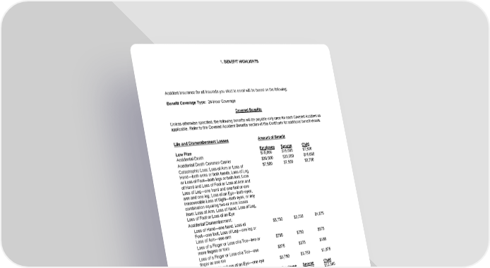 1. BENEFIT HIGHLIGHTS Accident insurance for all Insureds you elect to enroll will be based on the following: Benefit Coverage Type: 24-Hour Coverage Covered Benefits Unless otherwise specified, the following benefits will be payable only once for each Covered Accident as applicable. Refer to the Covered Accident Benefits section of this Certificate for additional benefit details. Life and Dismemberment Losses Amount of Benefit Low Plan Employee Spouse Child Accidental Death $15,000 $15,000 $7,500 Accidental Death Common Carrier $30,000 $30,000 $15,000 Catastrophic Loss: Loss of Arm or Loss of $7,500 $7,500 $3,750 Hand—both arms or both hands, Loss of Leg or Loss of Foot—both legs or both feet, Loss of Hand and Loss of Foot or Loss of Arm and Loss of Leg—one hand and one foot or one arm and one leg, Loss of an Eye—both eyes, irrecoverable Loss of Sight—both eyes, or any combination equaling two or more losses from: Loss of Arm, Loss of Hand, Loss of Leg, Loss of Foot or Loss of an Eye Accidental Dismemberment: Loss of Hand—one hand, Loss of $3,750 $3,750 $1,875 Foot—one foot, Loss of Leg—one leg or Loss of Arm—one arm Loss of a Finger or Loss of a Toe—two or $750 $750 $375 more fingers or toes Loss of a Finger or Loss of a Toe—one $375 $375 $188 finger or one toe Loss of Sight or Loss of an Eye—one eye $3,750 $3,750 $1,875 High Plan Employee Spouse Child Accidental Death $25,000 $25,000 $12,500 Accidental Death Common Carrier $100,000 $100,000 $50,000 Catastrophic Loss: Loss of Arm or Loss of $15,000 $15,000 $7,500 Hand—both arms or both hands, Loss of Leg or Loss of Foot—both legs or both feet, Loss of Hand and Loss of Foot or Loss of Arm and Loss of Leg—one hand and one foot or one arm and one leg, Loss of an Eye—both eyes, irrecoverable Loss of Sight—both eyes, or any combination equaling two or more losses from: Loss of Arm, Loss of Hand, Loss of Leg, Loss of Foot or Loss of an Eye Accidental Dismemberment: Loss of Hand—one hand, Loss of $7,500 $7,500 $3,750 Foot—one foot, Loss of Leg—one leg or 16-AC-C-01 Page5