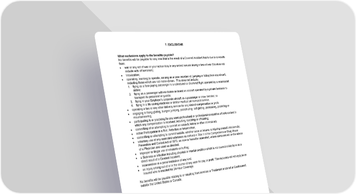 7. EXCLUSIONS What exclusions apply to the benefits payable? No benefits will be payable for any loss that is the result of a Covered Accident that is due to or results from: · war or any act of war or your active duty in any armed service during a time of war (this does not include acts of terrorism); · Intoxication; · operating, learning to operate, serving as a crew member of, jumping or falling from any aircraft, including those which are not motor-driven. This does not include: 1. flying as a fare paying passenger in a scheduled or chartered flight operated by a commercial airline; 2. flying as a passenger with no duties on board an aircraft operated by a private business to transport its personnel or guests; 3. flying in your Employer’s corporate aircraft as a passenger or crew member; or 4. flying in a life-saving medevac or similar medical air transport service; · operating a taxi or any other delivery service for any kind of compensation or profit; · engaging in hang-gliding, bungee jumping, parachuting, sail gliding, parasailing, parakiting or mountaineering; · participating in or practicing for any semi-professional or professional competitive athletic contest in which any compensation is received, including coaching or officiating; · committing of or attempting to commit an assault, felony or other criminal act; · active Participation in a Riot, Rebellion or Insurrection; · committing or attempting to commit suicide, whether sane or insane, or injuring oneself intentionally; · voluntary use of any controlled substance as defined in Title II of the Comprehensive Drug Abuse Prevention and Control Act of 1970, as now or hereafter amended, unless administered on the advice of a Physician and used as directed; · improper or illegal use of inhalants or huffing; · a Sickness or infection including physical or mental condition which is not caused solely by or as a direct result of a Covered Accident; · incarceration in a penal institution of any kind. · an Injury arising out of or in the course of any work for pay or profit. This exclusion will not apply to an Insured who is enrolled for 24-Hour Coverage. No benefits will be payable relating to or resulting from services or Treatment rendered or Confinement outside the United States or Canada. 16-AC-C-01 Page30