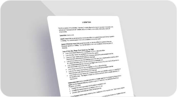 2. DEFINITIONS For the purposes of this definition, "operating" includes allowing the engine to run even if not seated in the vehicle and "motorized vehicle" includes, but is not limited to, automobiles, motorcycles, boats and snowmobiles. Laceration means a cut. Layoff means that you are temporarily not Actively at Work for a period of time your Employer agreed to in Writing. Your normal vacation time is not considered a temporary Layoff. Leave of Absence means that you are temporarily not Actively at Work for a period of time your Employer agreed to in Writing. Your normal vacation time is not considered a temporary Leave of Absence. Loss of Arm, Eye, Finger, Foot, Hand, Leg, Toe, Sight · Loss of Arm means that the arm is completely cut off at or above the elbow. · Loss of an Eye means the permanent removal of the eyeball. · Loss of a Finger means that the finger is completely cut off at the joint proximate to the first interphalangeal joint where it is attached to the hand. · Loss of Foot means the loss of at least four toes of the same foot or that the foot is completely cut off at or above the ankle joint or the use of the foot is permanently lost. · Loss of Hand means the loss of at least two fingers and a thumb of the same hand or the permanent and irrecoverable loss of use of the hand. · Loss of Leg means that the leg is completely cut off at or above the knee. · Loss of a Toe means that the toe is completely cut off at the joint proximate to the first interphalangeal joint where it is attached to the foot. · Loss of Sight of an eye means best corrected vision of the eye is 20/200 or worse, or a visual field of 20 degrees or less. The degree of visual loss must be permanent with no realistic expectation of improvement. Observation Unit means a specified area within a Hospital, apart from the Emergency Room, where a patient can be monitored following outpatient surgery or Treatment in the Emergency Room by a Physician and which: · is under the direct supervision of a Physician or registered nurse; · is staffed by nurses assigned specifically to that unit; and · provides care seven days per week, 24 hours per day. Open Surgery means surgery involving direct visualization of the impacted area. Open Surgery requires Anesthesia. Outpatient or Outpatient Treatment means Treatment received by the Insured at a Hospital or licensed ambulatory care facility and there is no charge for room and board. Paralysis means the Insured has been diagnosed by a Physician with total and irreversible loss of voluntary movement in muscles due to Injury of associated nerves that is consecutively present for 30 days, but shall not include any paralysis caused by a stroke. · Monoplegia is the complete and irreversible Paralysis of one arm or one leg. · Hemiplegia is the complete and irreversible Paralysis of one arm and one leg on the same side. · Diplegia is the complete and irreversible Paralysis of both arms. · Paraplegia is the complete and irreversible Paralysis of both legs. · Quadriplegia is the complete and irreversible Paralysis of both arms and both legs. Participation in a Riot, Rebellion or Insurrection, the words "Participation" and "Riot" in this phrase mean: Participation includes promoting, inciting, conspiring to promote or incite, aiding, abetting, and all forms of taking part in, but will not include actions taken in defense of public or private property, or actions taken in 16-AC-C-01 Page13