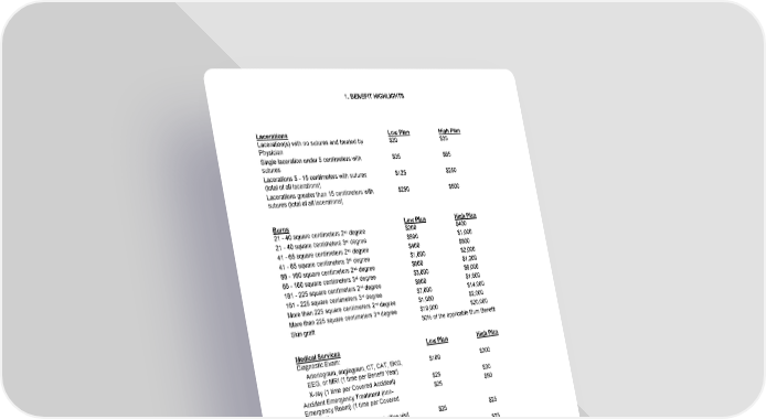 1. BENEFIT HIGHLIGHTS Lacerations Low Plan High Plan Laceration(s) with no sutures and treated by $20 $35 Physician Single laceration under 5 centimeters with $35 $65 sutures Lacerations 5 - 15 centimeters with sutures $125 $250 (total of all lacerations) Lacerations greater than 15 centimeters with $250 $500 sutures (total of all lacerations) Burns Low Plan High Plan nd 21 - 40 square centimeters 2 degree $200 $400 21 - 40 square centimeters 3rd degree $500 $1,000 nd 41 - 65 square centimeters 2 degree $400 $800 41 - 65 square centimeters 3rd degree $1,000 $2,000 66 - 160 square centimeters 2nd degree $600 $1,200 66 - 160 square centimeters 3rd degree $3,000 $6,000 161 - 225 square centimeters 2nd degree $800 $1,600 161 - 225 square centimeters 3rd degree $7,000 $14,000 nd More than 225 square centimeters 2 degree $1,000 $2,000 rd More than 225 square centimeters 3 degree $10,000 $20,000 Skin graft 50% of the applicable Burn Benefit Medical Services Low Plan High Plan Diagnostic Exam: Arteriogram, angiogram, CT, CAT, EKG, $100 $200 EEG, or MRI (1 time per Benefit Year) X-ray (1 time per Covered Accident) $25 $30 Accident Emergency Treatment (non- $25 $50 Emergency Room) (1 time per Covered Accident) Physician's follow-up Treatment office visit $25 $25 (per visit, up to 6 times per Covered Accident Physical and occupational therapy (per visit $25 $25 up to 10 visits per Covered Accident) Medical Devices $100 $125 Epidural Pain Management (up to 2 times per $25 $50 Covered Accident) Prescription drug $15 $25 Prosthesis (one) $250 $500 Prosthesis (two) $500 $1,000 Blood, plasma or platelet transfusion $100 $200 Hospital Low Plan High Plan Hospital admission (once per Benefit Year) $500 $1,000 16-AC-C-01 Page8