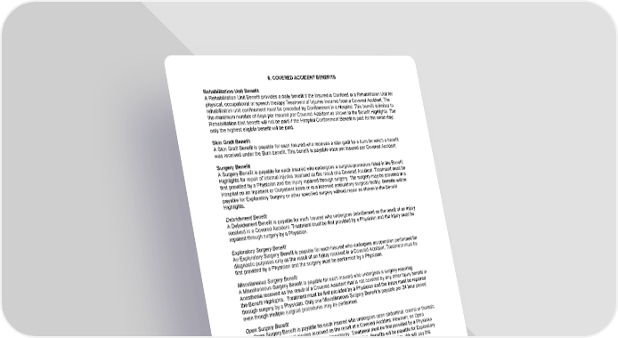 6. COVERED ACCIDENT BENEFITS Rehabilitation Unit Benefit A Rehabilitation Unit Benefit provides a daily benefit if the Insured is Confined in a Rehabilitation Unit for physical, occupational or speech therapy Treatment of Injuries incurred from a Covered Accident. The rehabilitation unit confinement must be preceded by Confinement in a Hospital. This benefit is limited to the maximum number of days per Insured per Covered Accident as shown in the Benefit Highlights. The Rehabilitation Unit benefit will not be paid if the Hospital Confinement Benefit is paid for the same day; only the highest eligible benefit will be paid. Skin Graft Benefit A Skin Graft Benefit is payable for each Insured who receives a skin graft for a burn for which a benefit was received under the Burn benefit. This benefit is payable once per Insured per Covered Accident. Surgery Benefit A Surgery Benefit is payable for each Insured who undergoes a surgical procedure listed in the Benefit Highlights for repair of internal Injuries received as the result of a Covered Accident. Treatment must be first provided by a Physician and the Injury repaired through surgery. The surgery may be provided in a Hospital on an Inpatient or Outpatient basis or in a licensed ambulatory surgical facility. Benefits will be payable for Exploratory Surgery or other specified surgery without repair as shown in the Benefit Highlights. Debridement Benefit A Debridement Benefit is payable for each Insured who undergoes debridement as the result of an Injury received in a Covered Accident. Treatment must be first provided by a Physician and the Injury must be repaired through surgery by a Physician. Exploratory Surgery Benefit An Exploratory Surgery Benefit is payable for each Insured who undergoes an operation performed for diagnostic purposes only as the result of an Injury received in a Covered Accident. Treatment must be first provided by a Physician and the surgery must be performed by a Physician. Miscellaneous Surgery Benefit A Miscellaneous Surgery Benefit is payable for each Insured who undergoes a surgery requiring Anesthesia received as the result of a Covered Accident that is not covered by any other Injury benefit in the Benefit Highlights. Treatment must be first provided by a Physician and the Injury must be repaired through surgery by a Physician. Only one Miscellaneous Surgery Benefit is payable per 24 hour period even though multiple surgical procedures may be performed. Open Surgery Benefit An Open Surgery Benefit is payable for each Insured who undergoes open abdominal, cranial or thoracic surgery to repair internal Injuries received as the result of a Covered Accident. However, an Open Surgery Benefit also includes exploratory laparotomy. Treatment must be first provided by a Physician and the Injury must be repaired through surgery by a Physician. Benefits will be payable for Exploratory Surgery or other specified surgery without repair as shown in the Benefit Highlights. We will pay this benefit once per Covered Accident. Ruptured/Herniated Disc Benefit A Ruptured/Herniated Disc Benefit is payable for each Insured who sustains a ruptured or herniated disc in the spine as the result of Injuries received in a Covered Accident. Treatment must be first provided by a Physician and the Injury repaired through surgery by a Physician. Tendon/Ligament/Rotator Cuff Benefit A Tendon/Ligament/Rotator Cuff Benefit is payable for each Insured who injures a tendon, ligament, or rotator cuff as the result of Injuries received in a Covered Accident. The tendon, ligament, or rotator cuff must be torn, ruptured or severed. Treatment must be first provided by a Physician and the Injury repaired through surgery by a Physician. If exploratory arthroscopic surgery is performed and no repair is done, the applicable amount payable is shown in the Benefit Highlights. 16-AC-C-01 Page28