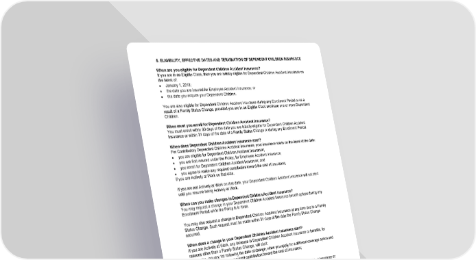 5. ELIGIBILITY, EFFECTIVE DATES AND TERMINATION OF DEPENDENT CHILDREN INSURANCE When are you eligible for Dependent Children Accident Insurance? If you are in an Eligible Class, then you are initially eligible for Dependent Children Accident Insurance on the latest of: · January 1, 2019; · the date you are insured for Employee Accident Insurance; or · the date you acquire your Dependent Children. You are also eligible for Dependent Children Accident Insurance during any Enrollment Period or as a result of a Family Status Change, provided you are in an Eligible Class and have one or more Dependent Children. When must you enroll for Dependent Children Accident Insurance? You must enroll within 90 days of the date you are initially eligible for Dependent Children Accident Insurance or within 31 days of the date of a Family Status Change or during any Enrollment Period. When does Dependent Children Accident Insurance start? For Contributory Dependent Children Accident Insurance, your insurance starts on the latest of the date: · you are eligible for Dependent Children Accident Insurance; · you are first insured under the Policy, for Employee Accident Insurance; · you enroll for Dependent Children Accident Insurance; and · you agree to make any required contribution toward the cost of insurance; if you are Actively at Work on that date. If you are not Actively at Work on that date, your Dependent Children Accident Insurance will not start until you resume being Actively at Work. When can you make changes in Dependent Children Accident Insurance? You may request a change in your Dependent Children Accident Insurance benefit options during any Enrollment Period while the Policy is in force. You may also request a change in Dependent Children Accident Insurance at any time due to a Family Status Change. Such request must be made within 31 days of the date the Family Status Change occurred. When does a change in your Dependent Children Accident Insurance start? If you are Actively at Work, any increase in Dependent Children Accident Insurance or benefits, for reasons other than a Family Status Change, will start: · on the January 1st following the date of change, when you apply for a different coverage option and you agree to make any required contribution toward the cost of insurance; · on the date of the Policy change. If you are not Actively at Work on that date, any increase in Dependent Children Accident Insurance or benefits will not start until you resume being Actively at Work. Whether or not you are Actively at Work, any reduction in Dependent Children Accident Insurance or benefits for reasons other than a Family Status Change, will start: · on the January 1st following the date of change, when you apply for a different coverage option; · on the date of the Policy change. If you are Actively at Work, any increase in Dependent Children Accident Insurance or benefits due to a Family Status Change will start on the latest of: · the date you apply for such change in Dependent Children Accident Insurance and you agree to make any required contribution toward the cost of the insurance; or · the date of your Family Status Change. 16-AC-C-01 Page20