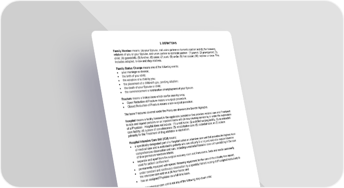 2. DEFINITIONS Family Member means: (a) your Spouse, civil union partner or domestic partner and (b) the following relatives of you or your Spouse, civil union partner or domestic partner: (1) parent; (2) grandparent; (3) child; (4) grandchild; (5) brother; (6) sister; (7) aunt; (8) uncle; (9) first cousin; (10) nephew or niece. This includes adopted, in-law and step-relatives. Family Status Change means one of the following events: · your marriage or divorce; · the birth of your child; · the adoption of a child by you; · the placement of a child with you, pending adoption; · the death of your Spouse or child; · the commencement or termination of employment of your Spouse. Fracture means a broken bone which can be seen by x-ray. · Open Reduction of Fracture means a surgical procedure. · Closed Reduction of Fracture means a non-surgical procedure. The bone Fractures covered under the Policy are shown in the Benefit Highlights. Hospital means a facility licensed in the applicable jurisdiction that provides medical care and Treatment to sick and injured persons on an Inpatient basis with 24 hour nursing service by or under the supervision of a Physician. Hospital does not include: (1) a rest home; (2) a skilled nursing facility; (3) an extended care facility; (4) a place of convalescence; (5) rehabilitative care; (6) custodial care; or (7) a place primarily for the Treatment of drug addiction or alcoholism. Hospital Intensive Care Unit (ICU) means: · a specifically designated part of a Hospital called an intensive care unit that provides the highest level of medical care and is restricted to patients who are critically ill or injured and who require intensive comprehensive observation and care, including a neonatal intensive care unit specializing in the care of ill or premature newborn infants; · separate and apart from the surgical recovery room and from rooms, beds and wards customarily used for patient confinement; · permanently equipped with special lifesaving equipment for the care of the critically ill or injured; · under constant and continuous observation by a specially trained nursing staff assigned exclusively to the intensive care unit on a 24 hour basis; and · has an assigned Physician on a full-time basis. A hospital intensive care unit is not any of the following step-down units: · a progressive care unit; · an intermediate care unit; · a private monitored room; · sub-acute intensive care unit; or · an observation unit. Incomplete Dislocation means a dislocation in which the joint is not completely separated. Injury means accidental body injury that is the direct result of a Covered Accident. Injuries must be independent of Sickness, disease, bodily infirmity and other causes. Inpatient or Inpatient Treatment means the Insured who receives Treatment as a resident patient using and being charged for the room and board facilities of a Hospital. Insured means any person covered under the Policy. Intoxicated or Intoxication means at or above the minimum blood alcohol level for which the Insured would be considered operating a motorized vehicle under the influence of alcohol in the jurisdiction where the Accident or Injury occurred. 16-AC-C-01 Page12