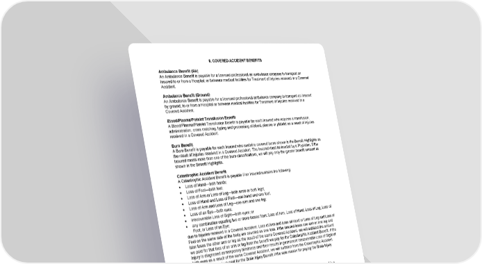 6. COVERED ACCIDENT BENEFITS Ambulance Benefit (Air) An Ambulance Benefit is payable for a licensed professional air ambulance company to transport an Insured to or from a Hospital, or between medical facilities for Treatment of Injuries received in a Covered Accident. Ambulance Benefit (Ground) An Ambulance Benefit is payable for a licensed professional ambulance company to transport an Insured by ground, to or from a Hospital or between medical facilities for Treatment of Injuries received in a Covered Accident. Blood/Plasma/Platelet Transfusion Benefit A Blood/Plasma/Platelet Transfusion Benefit is payable for each Insured who requires a transfusion, administration, cross matching, typing and processing of blood, plasma or platelet as a result of Injuries received in a Covered Accident. Burn Benefit A Burn Benefit is payable for each Insured who sustains covered burns shown in the Benefit Highlights as the result of Injuries received in a Covered Accident. The Insured must be treated by a Physician. If the Insured meets more than one of the burn classifications, we will pay only the greater benefit amount as shown in the Benefit Highlights. Catastrophic Accident Benefit A Catastrophic Accident Benefit is payable if an Insured sustains the following: · Loss of Hand—both hands; · Loss of Foot—both feet; · Loss of Arm or Loss of Leg—both arms or both legs; · Loss of Hand and Loss of Foot—one hand and one foot; · Loss of Arm and Loss of Leg—one arm and one leg; · Loss of an Eye—both eyes; · irrecoverable Loss of Sight—both eyes; or · any combination equaling two or more losses from: Loss of Arm, Loss of Hand, Loss of Leg, Loss of Foot, or Loss of an Eye; due to Injuries received in a Covered Accident. Loss of Arm and Loss of Hand or Loss of Leg and Loss of Foot on the same side of the body are counted as one loss. If the insured loses one arm or one leg and later loses the other arm or leg as the result of the same Covered Accident, we will subtract the amount we paid for that loss of an arm or leg from the benefit we pay for the Catastrophic Accident Benefit. If the Injury is diagnosed as temporary blindness and then results in permanent irrecoverable Loss of Sight of both eyes as a result of the same Covered Accident, we will subtract from the Catastrophic Accident Benefit the amount we paid for the Brain Injury Benefit if the sole reason for paying the Brain Injury Benefit was due to blindness. Coma Benefit A Coma Benefit is payable for each Insured who is in a Coma as the result of Injuries received in a Covered Accident. 16-AC-C-01 Page23