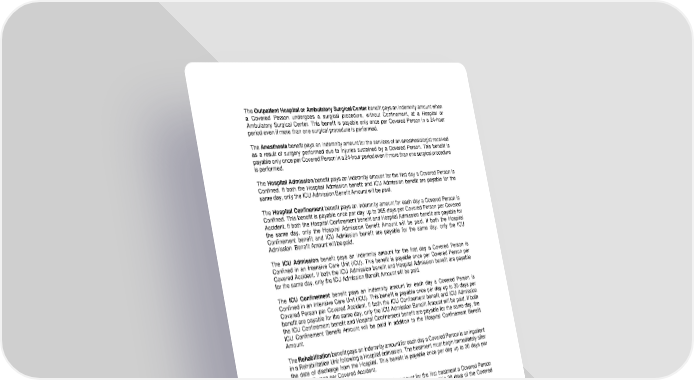 AO22OCFL 2 The Outpatient Hospital or Ambulatory Surgical Center benefit pays an indemnity amount when a Covered Person undergoes a surgical procedure, without Confinement, at a Hospital or Ambulatory Surgical Center. This benefit is payable only once per Covered Person in a 24-hour period even if more than one surgical procedure is performed. The Anesthesia benefit pays an indemnity amount for the services of an anesthesiologist received as a result of surgery performed due to Injuries sustained by a Covered Person. This benefit is payable only once per Covered Person in a 24-hour period even if more than one surgical procedure is performed. The Hospital Admission benefit pays an indemnity amount for the first day a Covered Person is Confined. If both the Hospital Admission benefit and ICU Admission benefit are payable for the same day, only the ICU Admission Benefit Amount will be paid. The Hospital Confinement benefit pays an indemnity amount for each day a Covered Person is Confined. This benefit is payable once per day up to 365 days per Covered Person per Covered Accident. If both the Hospital Confinement benefit and Hospital Admission benefit are payable for the same day, only the Hospital Admission Benefit Amount will be paid. If both the Hospital Confinement benefit and ICU Admission benefit are payable for the same day, only the ICU Admission Benefit Amount will be paid. The ICU Admission benefit pays an indemnity amount for the first day a Covered Person is Confined in an Intensive Care Unit (ICU). This benefit is payable once per Covered Person per Covered Accident. If both the ICU Admission benefit and Hospital Admission benefit are payable for the same day, only the ICU Admission Benefit Amount will be paid. The ICU Confinement benefit pays an indemnity amount for each day a Covered Person is Confined in an Intensive Care Unit (ICU). This benefit is payable once per day up to 30 days per Covered Person per Covered Accident. If both the ICU Confinement benefit and ICU Admission benefit are payable for the same day, only the ICU Admission Benefit Amount will be paid. If both the ICU Confinement benefit and Hospital Confinement benefit are payable for the same day, the ICU Confinement Benefit Amount will be paid in addition to the Hospital Confinement Benefit Amount. The Rehabilitation benefit pays an indemnity amount for each day a Covered Person is an inpatient in a Rehabilitation Unit following a Hospital admission. The treatment must begin immediately after the date of discharge from the Hospital. This benefit is payable once per day up to 30 days per Covered Person per Covered Accident. The Initial Treatment benefit pays an indemnity amount for the first treatment a Covered Person receives for Injuries sustained. Initial treatment must be received within 30 days of the Covered Accident. The Follow-Up Treatment benefit pays an indemnity amount for additional treatment over and above the initial medical treatment a Covered Person receives for Injuries sustained. The Follow- Up Treatment Benefit Amount will only be payable if the initial treatment was received within 30 days of the Covered Accident. This benefit is payable up to 6 follow-up treatments per Covered Person per Covered Accident. The Eye Injury benefit pays an indemnity amount for surgery of the eye or removal of a foreign object from the eye of a Covered Person that is a result of an Injury to one or both eyes. The Dislocation benefit pays an indemnity amount for a Covered Person who receives a Dislocation and requires Open or Closed Reduction. The amount payable for this benefit will be based on the joint Dislocated. We will pay the Open or Closed Reduction Benefit Amount as shown in the Schedule of Benefits if the Dislocation is repaired by a Physician under general anesthesia.