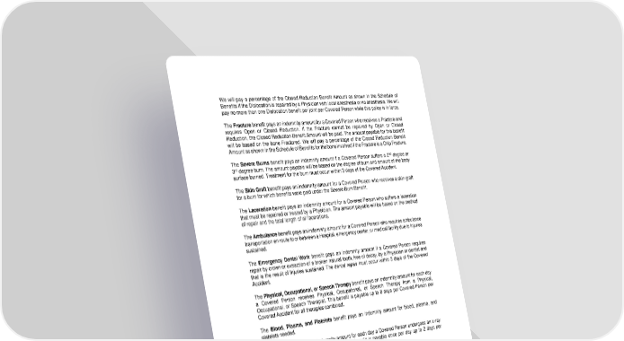AO22OCFL 3 We will pay a percentage of the Closed Reduction Benefit Amount as shown in the Schedule of Benefits if the Dislocation is repaired by a Physician with local anesthesia or no anesthesia. We will pay no more than one Dislocation benefit per joint per Covered Person while this policy is in force. The Fracture benefit pays an indemnity amount for a Covered Person who receives a Fracture and requires Open or Closed Reduction. If the Fracture cannot be repaired by Open or Closed Reduction, the Closed Reduction Benefit Amount will be paid. The amount payable for this benefit will be based on the bone Fractured. We will pay a percentage of the Closed Reduction Benefit Amount as shown in the Schedule of Benefits for the bone involved if the Fracture is a Chip Fracture. The Severe Burns benefit pays an indemnity amount if a Covered Person suffers a 2nd degree or 3rd degree burn. The amount payable will be based on the degree of burn and amount of the body surface burned. Treatment for the burn must occur within 3 days of the Covered Accident. The Skin Graft benefit pays an indemnity amount for a Covered Person who receives a skin graft for a burn for which benefits were paid under the Severe Burn Benefit. The Laceration benefit pays an indemnity amount for a Covered Person who suffers a laceration that must be repaired or treated by a Physician. The amount payable will be based on the method of repair and the total length of all lacerations. The Ambulance benefit pays an indemnity amount for a Covered Person who requires ambulance transportation en route to or between a Hospital, emergency center, or medical facility due to Injuries sustained. The Emergency Dental Work benefit pays an indemnity amount if a Covered Person requires repair by crown or extraction of a broken natural tooth, free of decay, by a Physician or dentist and that is the result of Injuries sustained. The dental repair must occur within 3 days of the Covered Accident. The Physical, Occupational, or Speech Therapy benefit pays an indemnity amount for each day a Covered Person receives Physical, Occupational, or Speech Therapy from a Physical, Occupational, or Speech Therapist. This benefit is payable up to 8 days per Covered Person per Covered Accident for all therapies combined. The Blood, Plasma, and Platelets benefit pays an indemnity amount for blood, plasma, and platelets needed. The X-ray benefit pays an indemnity amount for each day a Covered Person undergoes an x-ray for the purpose of diagnosing an Injury. This benefit is payable once per day up to 2 days per Covered Person per Covered Accident. The Medical Imaging benefit pays an indemnity amount if a Covered Person undergoes a Computerized Tomography (CT or CAT), Magnetic Resonance Imaging (MRI), Single-Photon Emission Computed Tomography (SPECT), Positron Emission Tomography (PET) scan, or an ultrasound, for the purpose of diagnosing an Injury. The Gunshot Wound benefit pays an indemnity amount if a Covered Person receives a gunshot wound and the gunshot wound does not cause the Covered Person to die; is caused by a shot from a Conventional Firearm; requires treatment by a Physician within 24 hours of the Covered Accident; and requires a Confinement. The Epidural Pain Management benefit pays an indemnity amount if a Covered Person receives an epidural injection into the epidural space for management of pain due to an Injury.