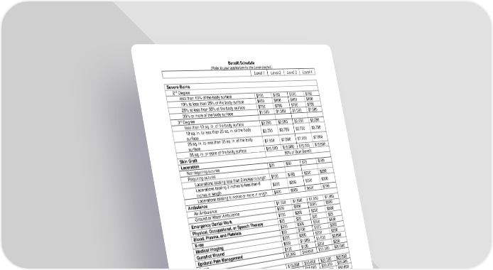 Benefit Schedule (Refer to your application for the Level elected.) Level 1 Level 2 Level 3 Level 4 AO22OCFL 7 Severe Burns 2nd Degree less than 10% of the body surface $150 $150 $150 $150 10% to less than 25% of the body surface $450 $450 $450 $450 25% to less than 35% of the body surface $750 $750 $750 $750 35% or more of the body surface $1,500 $1,500 $1,500 $1,500 3rd Degree less than 10 sq. in. of the body surface $2,250 $2,250 $2,250 $2,250 10 sq. in. to less than 25 sq. in. of the body surface $3,750 $3,750 $3,750 $3,750 25 sq. in. to less than 35 sq. in. of the body surface $7,500 $7,500 $7,500 $7,500 35 sq. in. or more of the body surface $15,000 $15,000 $15,000 $15,000 Skin Graft 50% of Burn Benefit Laceration Not requiring sutures $25 $50 $75 $100 Requiring sutures Lacerations totaling less than 2 inches in length $100 $150 $200 $250 Lacerations totaling 2 inches to less than 6 inches in length $200 $250 $300 $350 Lacerations totaling 6 inches or more in length $400 $500 $600 $700 Ambulance Air Ambulance $1,500 $1,500 $1,500 $1,500 Ground or Water Ambulance $500 $500 $500 $500 Emergency Dental Work $150 $200 $250 $300 Physical, Occupational, or Speech Therapy $25 $25 $25 $25 Blood, Plasma, and Platelets $250 $300 $350 $400 X-ray $50 $100 $150 $200 Medical Imaging $200 $200 $200 $200 Gunshot Wound $500 $1,000 $1,500 $2,000 Epidural Pain Management $100 $150 $200 $250 Coma $5,000 $10,000 $15,000 $20,000 Paralysis Uniplegia $10,000 $15,000 $20,000 $25,000 Paraplegia $10,000 $15,000 $20,000 $25,000 Quadriplegia $20,000 $30,000 $40,000 $50,000 Appliance $100 $150 $200 $250 Prosthesis (per device) $500 $500 $500 $500 Transportation $300 $300 $300 $300 Family Member Lodging and Meals $100 $100 $100 $100 Concussion $200 $250 $300 $350 Traumatic Brain Injury $1,000 $1,500 $2,000 $2,500 Accident Screening $50 $50 $75 $75 THE REMAINDER OF THIS PAGE INTENTIONALLY LEFT BLANK Continued on next page