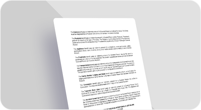 AO22OCFL 4 The Coma benefit pays an indemnity amount if a Covered Person is rendered Comatose. The Coma must be diagnosed by a Physician and continue for at least 14 consecutive days. The Paralysis benefit pays an indemnity amount if a Covered Person suffers Paralysis. The amount paid will be based on the type of Paralysis. The Paralysis must be diagnosed by a Physician and continue for at least 90 consecutive days. This benefit is payable only once per lifetime per Covered Person. The Appliance benefit pays an indemnity amount for a wheelchair, motorized scooter, walker, walking boot, brace, cane, crutches, or any other medical device used for mobility to aid a Covered Person. The Prosthesis benefit pays an indemnity amount if a Covered Person requires the use of a prosthesis as a result of Injuries sustained. This benefit is payable per device up to two devices per Covered Person per Covered Accident. The Transportation benefit pays an indemnity amount for transportation of a Covered Person who requires treatment and is Confined in a non-local Hospital due to Injuries sustained. This benefit is payable only once per round trip up to 3 round trips per Covered Person per Covered Accident. Transportation benefits will only be provided for the Injured Covered Person. The Family Member Lodging and Meals benefit pays an indemnity amount, up to 30 days, for lodging and meals for a family member to be near a Covered Person who has been Confined in a Hospital. The Concussion benefit pays an indemnity amount for a Covered Person that suffers a Concussion. The diagnosis must be made within 7 days of the Covered Accident. The Traumatic Brain Injury benefit pays an indemnity amount for a Covered Person that is Confined for at least 48 hours as a result of a Traumatic Brain Injury (TBI). The diagnosis and Confinement must occur within 3 days of the Covered Accident. The Accident Screening benefit pays an indemnity amount if a Covered Person receives one of the following screenings rendered by a Physician: bone density screening; Epworth Sleepiness Scale for the purpose of diagnosing a sleeping disorder; hemoglobin A1c; routine physical exam; sports physicals; or stress test. This benefit is payable once per policy per Calendar Year. THE REMAINDER OF THIS PAGE INTENTIONALLY LEFT BLANK Continued on next page
