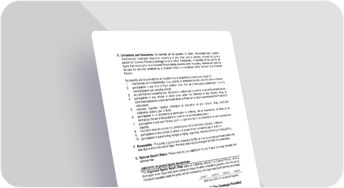 AO22OCFL 8 E. Limitations and Exclusions. No benefits will be payable for death, Dismemberment, surgery, Confinement, treatment, diagnosis, screening or any other care or service incurred during any period the Covered Person’s coverage is not in effect. Additionally, no benefits will be paid for an Injury that occurs prior to a Covered Person being covered under the policy. Benefits will also not be paid for services rendered by a Covered Person or immediate family member of a Covered Person. No benefits will be provided for an Accident that is caused by or occurs as a result of: 1. intentionally self-inflicted bodily injury, suicide or attempted suicide, whether sane or insane; 2. participation in any form of flight aviation other than as a fare-paying passenger in a fully licensed/passenger-carrying aircraft; 3. any act that was caused by war, declared or undeclared, or service in any of the armed forces; 4. participation in any activity or event while under the influence of any narcotic, drug, or controlled substance unless administered by a Physician or taken according to the Physician's instructions; 5. voluntary ingestion, injection, inhalation or absorption of any narcotic, drug, controlled substance, poison, gas, or fume; 6. participation in, or attempting to participate in, a felony, riot or insurrection; (A felony is as defined by the law of the jurisdiction in which the activity takes place.) 7. participation in any sport for pay, profit, or sponsorship, in a professional or semi-professional capacity; 8. treatment received outside the United States and its territories, Canada, or Mexico; 9. participation in any contest of speed in a power driven vehicle for pay or profit; or 10. participation in parachuting, bungee jumping, rappelling, mountain climbing or hang gliding. F. Renewability - The policy is guaranteed renewable for life, as long as you pay premiums before the date due or within the next 31 days. Premium rates may be changed, but only on a class basis. G. Optional Benefit Riders: Please refer to your application to see if your coverage includes this optional rider. AMDI551FL Organized Sports Benefit Rider The Organized Sports Benefit Rider pays an indemnity amount if a Covered Person, while a Participant in an Organized Sport, suffers an Injury for which a benefit is payable under this policy. The benefit payable under the policy will be increased by the Organized Sports benefit percentage. Level 1 Level 2 Level 3 Level 4 Additional 25% of the benefit payable This Outline of Coverage Is Only A Summary Of The Coverage Provided. Only The Actual Policy Provisions Will Control.