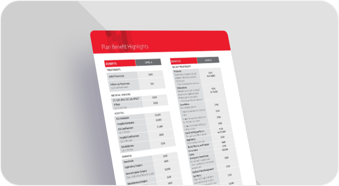 ALL COVERAGE LEVELS Plan Benefit Highlights BENEFITS LEVEL 4 TREATMENTS Initial Treatment $300 Follow-up Treatment Up to six treatments $50 MEDICAL IMAGING CT, CAT, MRI, PET, US, SPECT $200 X-Rays Up to two days $200 HOSPITAL ICU Admission $2,500 Hospital Admission $2,000 ICU Confinement Up to 30 days $1,600 Hospital Confinement Up to 365 days $400 Rehabilitation Up to 30 days $200 AMBULANCE Ground/Water $500 Air $1,500 SURGICAL Anesthesia $300 Exploratory Surgery $400 Internal Injuries Surgery Open abdominal/thoracic surgery $2,500 Miscellaneous Surgery $250 Outpatient Hospital or Ambulatory Surgical Center $450 Ruptured Disc or Torn Knee Cartilage Surgery $500 Tendons, Ligaments, and Rotator Cuff Surgery One tendon, ligament, or rotator cuff More than one tendon, ligament, or rotator cuff $500 $750 FAMILY SUPPORT Transportation Up to 3 round trips per Covered Person per Covered Accident $300 Family Member Lodging and Meals Per day per accident; Up to 30 days per Covered Accident $100 ALL COVERAGE LEVELS MONTHLY PREMIUMS LEVEL 4 Individual $41.80 Individual & Spouse $48.90 Individual & Child(ren) $63.10 Family $71.10 BENEFITS LEVEL 4 INJURY TREATMENTS Fractures Depending on open or closed reduction and bone involved Chip fracture - 25% of closed reduction amount $375 to $10,000 Dislocations Depending on open or closed reduction and joint involved With local or no anesthesia - 25% of closed reduction amount $375 to 10,000 Lacerations Not requiring sutures Sutured lacerations less than two inches Sutured lacerations totaling two but less than six inches Sutured lacerations totaling six inches or more $100 $250 $350 $700 2nd & 3rd Degree Burns Skin grafts are 50% of benefit $150 to $15,000 Appliances Crutches, leg braces, etc. $250 Blood, Plasma, and Platelet $400 Concussion $350 Coma $20,000 Emergency Dental Work Broken teeth repaired with crown or extraction of a broken natural tooth $300 Epidural Pain Management $250 Eye Injury Injury with surgical repair or removal of foreign body by physician, for one or both eyes $350 Gunshot Wound $2,000 Paralysis Paraplegia/Uniplegia Quadriplegia $25,000 $50,000 Physical, Occupational, or Speech Therapy Per day of treatment up to eight days combined $25 Prosthesis Up to two devices $500 Traumatic Brain Injury $2,500