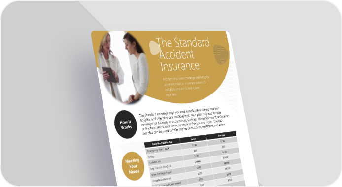 The Standard Accident Insurance Accident Insurance coverage can help pick up where medical insurance leaves off and provide cash to help cover expenses. The Standard coverage pays you cash benefits that correspond with How it hospital and intensive care confinement. Your plan may also include Works coverage for a variety of occurrences, such as: dismemberment; dislocation or fracture; ambulance services; physical therapy and more. The cash benefits can be used to help pay for deductibles, treatment, and more. Benefits Paid to You Select Premier Emergency Room Visit $100 $200 Meeting X-Ray $25 $60 Your Concussion $100 $200 Needs Leg Fracture (Surgical) $1,600 $3,400 Knee Cartilage Repair $400 $1,000 Hospital Admission $500 $1,500 2 Days Hospital Confinement $200 $800 Medical Appliance $50 $200 Physician Follow-Up $50 $70 Appointments 2 Physical Therapy Appointments $100 $100 Select Monthly Premiums Premier Monthly Premiums Employee Only $7.61 Employee Only $14.66 Plan Employee + Spouse $13.22 Employee + Spouse $24.02 Costs Employee + Child(ren) $13.80 Employee + Child(ren) $27.12 Family $22.01 Family $42.75