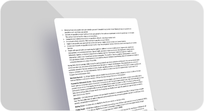 INPPOSUM1123 KR#09780076 Bitewing X-rays are payable once per calendar year and full mouth X-rays (which include bitewing X-rays) or a panorex are payable once in any three-year period. Sealants are payable once per tooth per three-year period for first and second permanent molars for people age 13 and under. The surface must be free from decay and restorations. Composite resin (white) restorations are payable on all teeth, including posterior teeth. An occlusal orthotic device for TMD treatment is payable once per lifetime. Implants are payable once per tooth in any five-year period. Implant related services are Covered Services. Crowns over implants are payable once per tooth in any five-year period. Services related to crowns over implants are Covered Services. People with special health care needs may be eligible for additional services including exams, hygiene visits, dental case management, and sedation/anesthesia. Special health care needs include any physical, developmental, mental, sensory, behavioral, cognitive, or emotional impairment or limiting condition that requires medical management, healthcare intervention, and/or use of specialized services or programs. The condition may be congenital, developmental, or acquired through disease, trauma, or environmental cause and may impose limitations in performing daily self-maintenance activities or substantial limitations in a major life activity. Having Delta Dental coverage makes it easy for you to get dental care almost everywhere in the world! You can now receive expert dental care when you are outside of the United States through our Passport Dental program. This program gives you access to a worldwide network of Dentists and dental clinics. English-speaking operators are available around the clock to answer questions and help you schedule care. For more information, check our website or contact your benefits representative to get a copy of our Passport Dental information sheet. Maximum Payment – $1,250 per Member total per Benefit Year on all services, except orthodontic services. $1,000 per Member total per lifetime on orthodontic services. $750 per Member total per lifetime on TMD treatment. Payment for Orthodontic Service – When orthodontic treatment begins, your Dentist will submit a payment plan to Delta Dental based upon your projected course of treatment. In accordance with the agreed upon payment plan, Delta Dental will make an initial payment to you or your Participating Dentist equal to Delta Dental's stated Copayment on 30% of the Maximum Payment for Orthodontic Services as set forth in this Summary of Dental Plan Benefits. Delta Dental will make additional payments as follows: Delta Dental will pay 50% of the per month fee charged by your Dentist based upon the agreed upon payment plan provided by Delta Dental to your Dentist. Deductible – $50 Deductible per Member total per Benefit Year limited to a maximum Deductible of $100 per family per Benefit Year. The Deductible does not apply to diagnostic and preventive services, emergency palliative treatment, brush biopsy, X-rays, sealants, and periodontal maintenance. Waiting Period – Enrollees who are eligible for Benefits are covered on the date of hire. Eligible People – All full-time employees of the Contractor working at least 29.5 hours per week who choose the dental plan (0001), (1001) and all Enrollees who are eligible for and elect Continuation Coverage pursuant to the Consolidated Omnibus Budget Reconciliation Act of 1985 or similar non-preempted state law ("COBRA") (0099). Also eligible are your Spouse and your Children to the end of the month in which they turn 26, including your Children who are married, who no longer live with you, who are not your dependents for Federal income tax purposes, and/or who are not permanently disabled. Also eligible is your domestic partner, as defined by the Contractor. Domestic partners will be treated as Spouses under This Plan. Enrollees and Dependents choosing this plan are required to remain enrolled for a minimum of 12 months. Should an Enrollee or Dependent choose to drop coverage after that time, he or she may not re-enroll prior to the date on which 12 months have elapsed. Dependents may only enroll if the Enrollee is enrolled (except under COBRA) and must be enrolled in the same plan as the Enrollee. An election may be revoked or changed at any time if the change is the result of a qualifying event as defined under Internal Revenue Code Section 125.
