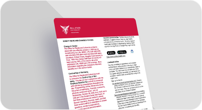 BENEFIT NEWS AND CHANGES FOR 2026 Change in Vendor The Office for People and Culture is excited to share with you effective January 1, 2026 we are transitioning our Life, AD&D, LTD, both ASO-STD and voluntary STD plans and voluntary GAP plans (Accident, Critical Illness, Hospital Confinement) to Voya. With this change, Ball State University will begin paying 100% of the cost for all active employees Life, AD&D and LTD coverage. More information regarding the changes to voluntary benefits are in the section below. Cardinal Day of Well-being The Office for People and Culture is proud to announce the Cardinal Day of Well- being. This day will be in conjunction with the Employee Benefits Fair and will be enhanced with well-being presentations throughout the day. Programming will be offered around the five pillars of well-being: financial, community, physical, social and career. Join us Wednesday, October 29, 2025, from 10:00 am to 3:00 pm in the Student Center Ball Room. All Ball State employees are invited to attend. Several insurance, financial, health, and Ball State vendors will be in attendance to answer questions, conduct presentations, or provide services and information. HIGHLIGHTED BENEFIT FEATURES Sydney Health Sydney Health will allow you to get benefits information when and where you need it. If you have a current Anthem login, you will use the same login information to access Sydney. You may download the app to your smartphone and obtain services such as: • View your Anthem insurance card • Find physicians and check costs for services • See your health claims and track healthcare spending • Ask Sydney’s interactive chat bot questions With Ball State’s health plan being self-funded, we strive for all plan members to use Sydney Health to check and compare costs for services. By being good stewards of our insurance expenditures, we can all work to keep our health claims and insurance premiums low. Sydney can provide alerts, reminders, suggest a doctor, help you stay healthy and save money on medical costs. We encourage all health plan members to download the Sydney Health app from the App Store or Google Play to get started. https://www.sydneyhealth.com/ LiveHealth Online You may schedule an appointment with a board– certified doctor online anytime of the day or night using LiveHealth Online on your smartphone, tablet or computer. You don’t even have to leave your home. It’s a great option for care when your own doctor isn’t available—and it’s more convenient than a trip to the urgent care. Sign up for free to: · Get access to board-certified doctors 24/7. Doctors using LiveHealth Online can provide medical care for common conditions like the flu, colds, pink eye and more. They can send prescriptions to the pharmacy of your choice if needed. · See a licensed therapist or psychologist. If you’re feeling stressed, worried or having a tough time, LiveHealth Online can help. In most cases, you can make an appointment to see a therapist or psychologist online in four days or less.Depending on your coverage, the cost may be similar to what you would pay for an office visit, considering your benefits. It’s quick and easy to sign up and get started. Just go to livehealthonline.com or download the mobile app. HSA Qualified Health Plan While this plan has the highest deductibles, it also continues to have the lowest premiums, both of which can be offset by the contributions (HSA seed) that the University makes to your HSA account. The HSA Qualified Health Plan provides comprehensive medical coverage with access to Anthem’s broad provider network and 100% coverage for in-network preventive care. However, non-preventive medical and prescription expenses both accumulate toward the same deductible and out-of-pocket maximum. Once you have met your