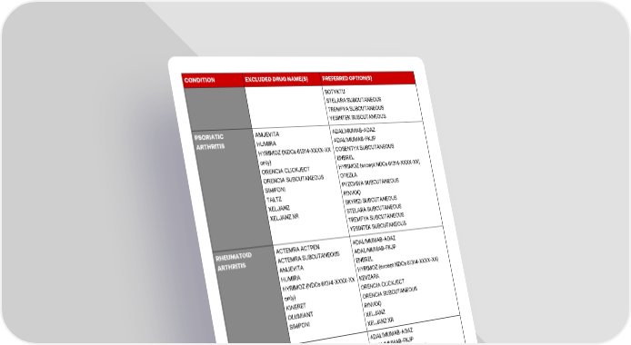 12 CONDITION EXCLUDED DRUG NAME(S) PREFERRED OPTION(S) SOTYKTU STELARA SUBCUTANEOUS TREMFYA SUBCUTANEOUS YESINTEK SUBCUTANEOUS PSORIATIC ARTHRITIS AMJEVITA HUMIRA HYRIMOZ (NDCs 61314-XXXX-XX only) ORENCIA CLICKJECT ORENCIA SUBCUTANEOUS SIMPONI TALTZ XELJANZ XELJANZ XR ADALIMUMAB-ADAZ ADALIMUMAB-FKJP COSENTYX SUBCUTANEOUS ENBREL HYRIMOZ (except NDCs 61314-XXXX-XX) OTEZLA PYZCHIVA SUBCUTANEOUS RINVOQ SKYRIZI SUBCUTANEOUS STELARA SUBCUTANEOUS TREMFYA SUBCUTANEOUS YESINTEK SUBCUTANEOUS RHEUMATOID ARTHRITIS ACTEMRA ACTPEN ACTEMRA SUBCUTANEOUS AMJEVITA HUMIRA HYRIMOZ (NDCs 61314-XXXX-XX only) KINERET OLUMIANT SIMPONI ADALIMUMAB-ADAZ ADALIMUMAB-FKJP ENBREL HYRIMOZ (except NDCs 61314-XXXX-XX) KEVZARA ORENCIA CLICKJECT ORENCIA SUBCUTANEOUS RINVOQ XELJANZ XELJANZ XR ULCERATIVE COLITIS AMJEVITA HUMIRA HYRIMOZ (NDCs 61314-XXXX-XX only) SIMPONI ADALIMUMAB-ADAZ ADALIMUMAB-FKJP ENTYVIO SUBCUTANEOUS HYRIMOZ (except NDCs 61314-XXXX-XX) PYZCHIVA SUBCUTANEOUS RINVOQ SKYRIZI SUBCUTANEOUS STELARA SUBCUTANEOUS TREMFYA SUBCUTANEOUS VELSIPITY YESINTEK SUBCUTANEOUS ZEPOSIA
