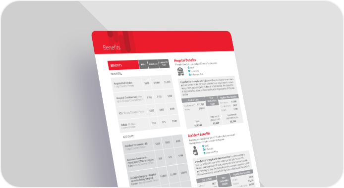 BENEFITS BASIC ENHANCED ENHANCED PLUS HOSPITAL Hospital Admission 1 day/Covered Person $500 $1,000 $1,500 Hospital Confinement Pays up to 30 days/Covered Person $100 $150 $200 ICU 10 days/Covered Person $200 $300 $400 Rehab 10 days/ Covered Person $50 $75 $100 ACCIDENT Accident Treatment - ER 3 days/Covered Person $200 $300 $400 Accident Treatment - Physician’s Office or Urgent Care 6 days/Covered Person $50 $75 $100 Accident Surgery - Hospital or Ambulatory Surgical Center 3 days/Covered Person $1,000 $1,500 $2,000 Accident Surgery - Physician’s Office or Urgent Care 6 days/Covered Person $125 $125 $250 Hospital Benefits If hospitalized, you can get paid directly for the costs. Basic Enhanced Enhanced Plus Accident Benefits Weekend warrior? Active family? Or a long daily commute? No matter your situation, accidents happen. Basic Enhanced Enhanced Plus Benefits Hypothetical Example with Enhanced Plan You are traveling in your car and are hit by a driver running a red light. Your arm is broken and requires an ER visit, surgery, admission to the hospital, and two nights’ stay. The deductible in this example is based on a 2020 IRS minimum family medical HSA High Deductible Health Plan (HDHP). Cost of Care Your Deductible $2,800 Payable Plan Benefits ER Visit5 $827 Surgery6 $16,000 ER Visit $300 Surgery $1,500 Hospital Admission $1,000 Hospital Confinement $300 Total out-of- pocket cost7 $5,605 Total Cost of Care $16,827 Total benefit payment to you $3,100 Hypothetical Example with Enhanced Plan You have a car accident and are rushed to the ER. You’re admitted and stay 3 days for a back injury. Then, you complete 10 days of rehabilitation. The deductible in this example is based on Preferred Provider Organization (PPO) plan option Cost of Care Your Deductible $500 Payable Plan Benefits Confinement3 $11,728 Rehab4 $1,620 Admission $1,000 Confinement $450 Rehab $750 Total $13,348 Total out of pocket cost7 $3,069 Total benefit payment to you $2,200 Refer to the Plan Benefit Highlights section for additional information. Benefits are paid on a calendar year basis.