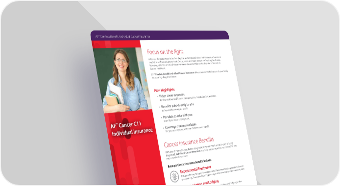 E M P L O Y E R B E N E F I T S O L U T I O N S F O R E D U C AT I O N AF™ Cancer C11 Individual Insurance Focus on the fight. A Cancer diagnosis may be both a physical and emotional drain. But thanks to advances in medicine and procedures to treat Cancer, more and more people are beating the disease. However, with the arrival of these advances also comes the continuing rise in the cost of Cancer treatment. AF™ Limited Benefit Individual Cancer Insurance offers a solution to help you and your family focus on fighting the disease. Plan Highlights • Helps cover expenses for the treatment of Cancer, transportation, hospitalization, and more. • Benefits paid directly to you to be used however you see fit. • Portable to take with you even if you leave employment. • Coverage options available for you, your spouse, and your children under age 26. DIAGNOSTIC AND PREVENTION BENEFIT (per calendar year) BASIC ENHANCED ENHANCED PLUS $60 $75 $90 SCREENING BENEFIT+ Receive a benefit for your annual internal Cancer screening test, including but not limited to mammogram, pap, prostate-specific antigen blood test (PSA), chest x-ray, flexible sigmoidoscopy, thinprep pap test, and colonoscopy. +The premium and amount of benefits provided vary based upon the plan selected. Cancer Insurance Benefits With over 25 benefits specifically designed to help with the financial impact of being diagnosed, Individual Cancer Insurance may help pay for expenses not covered by your major medical insurance. Example Cancer insurance benefits include: Experimental Treatment This benefit may help pay for experimental treatment to give you alternatives in your healing. These treatment types may not be covered by major medical plans. Transportation and Lodging This benefit may help pay for qualified transportation and lodging for the patient and family. AF™ Limited Benefit Individual Cancer Insurance
