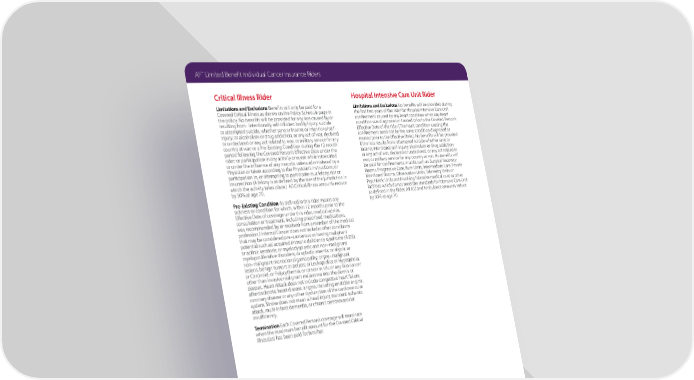 AF™ Limited Benefit Individual Cancer Insurance Riders SB-32507(IN)(AFES)-1019 Critical Illness Rider Limitations and Exclusions Benefits will only be paid for a Covered Critical Illness as shown on the Policy Schedule page in the policy. No benefits will be provided for any loss caused by or resulting from: intentionally self-inflicted bodily injury, suicide or attempted suicide, whether sane or insane; or intentional self- injury; or alcoholism or drug addiction; or any act of war, declared or undeclared or any act related to war; or military service for any country at war; or a Pre-Existing Condition during the 12 month period following the Covered Person’s Effective Date under the rider; or participation in any activity or event while intoxicated or under the influence of any narcotic unless administered by a Physician or taken according to the Physician’s instructions; or participation in, or attempting to participate in, a felony, riot or insurrection (A felony is as defined by the law of the jurisdiction in which the activity takes place.) All Critical Illness amounts reduce by 50% at age 70. Pre-Existing Condition As defined in this rider means any sickness or condition for which, within 12 months prior to the Effective Date of coverage under this rider, medical advice, consultation or treatment, including prescribed medications, was recommended by or received from a member of the medical profession.) Internal Cancer does not include: other conditions that may be considered pre–cancerous or having malignant potential such as: acquired immune deficiency syndrome (AIDS); or actinic keratosis; or myelodysplastic and non–malignant myeloproliferative disorders; or aplastic anemia; or atypia; or non–malignant monoclonal gamopathy; or pre–malignant lesions, benign tumors or polyps; or Leukoplakia; or Hyperplasia; or Carcinoid; or Polycythemia; or cancer in situ or any skin cancer other than invasive malignant melanoma into the dermis or deeper.. Heart Attack does not include congestive heart failure, atherosclerotic heart disease, angina, including unstable angina, coronary disease or any other dysfunction of the cardiovascular system. Stroke does not mean a head injury, transient ischemic attack, multi-infarct dementia, or chronic cerebrovascular insufficiency. Termination Each Covered Person’s coverage will terminate when the maximum benefit amount for the Covered Critical Illness(es) has been paid for him/her. Hospital Intensive Care Unit Rider Limitations and Exclusions No benefits will be provided during the first two years of the rider for Hospital Intensive Care Unit confinement caused by any heart condition when any heart condition was diagnosed or treated prior to the Covered Person’s Effective Date of the rider (The heart condition causing the confinement need not be the same condition diagnosed or treated prior to the Effective Date.). No benefits will be provided if the loss results from: attempted suicide whether sane or insane; intentional self–injury; alcoholism or drug addiction; or any act of war, declared or undeclared, or any act related to war; or military service for any country at war. No benefits will be paid for confinements in units such as: Surgical Recovery Rooms, Progressive Care, Burn Units, Intermediate Care, Private Monitored Rooms, Observation Units, Telemetry Units or Psychiatric Units not involving intensive medical care; or other facilities which do not meet the standards for Intensive Care Unit as defined in the Rider. All ICU and Ambulance amounts reduce by 50% at age 70. This is a brief description of the coverage. For complete benefits and other provisions, please refer to the policy and riders. This coverage does not replace Workers’ Compensation Insurance. These products are inappropriate for people who are eligible for Medicaid Coverage. This insert must be used in conjunction with SB-30641 and any state specific deviations thereof. American Fidelity Assurance Company 9000 Cameron Parkway, Oklahoma City, Oklahoma 73114 800-662-1113 • americanfidelity.com Policy Form Series AMDI239 and AMDI240 Plan Code 013-776, 013-777, and 013-769