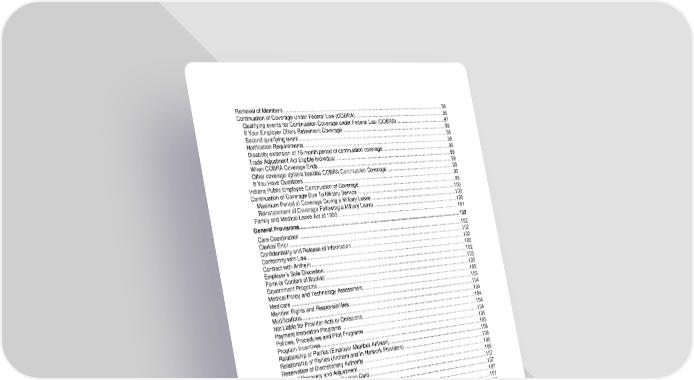 11 Removal of Members ................................................................................................................................96 Continuation of Coverage Under Federal Law (COBRA)..........................................................................96 Qualifying events for Continuation Coverage under Federal Law (COBRA).........................................97 If Your Employer Offers Retirement Coverage......................................................................................98 Second qualifying event.........................................................................................................................98 Notification Requirements......................................................................................................................98 Disability extension of 18-month period of continuation coverage ........................................................98 Trade Adjustment Act Eligible Individual ...............................................................................................99 When COBRA Coverage Ends..............................................................................................................99 Other coverage options besides COBRA Continuation Coverage ........................................................99 If You Have Questions...........................................................................................................................99 Indiana Public Employee Continuation of Coverage.................................................................................99 Continuation of Coverage Due To Military Service .................................................................................100 Maximum Period of Coverage During a Military Leave .......................................................................100 Reinstatement of Coverage Following a Military Leave ......................................................................100 Family and Medical Leave Act of 1993 ...................................................................................................101 General Provisions..................................................................................................................................102 Care Coordination ...................................................................................................................................102 Clerical Error............................................................................................................................................102 Confidentiality and Release of Information..............................................................................................102 Conformity with Law ................................................................................................................................102 Contract with Anthem ..............................................................................................................................102 Employer’s Sole Discretion......................................................................................................................103 Form or Content of Booklet .....................................................................................................................103 Government Programs ............................................................................................................................103 Medical Policy and Technology Assessment ..........................................................................................103 Medicare..................................................................................................................................................104 Member Rights and Responsibilities .......................................................................................................104 Modifications............................................................................................................................................104 Not Liable for Provider Acts or Omissions...............................................................................................104 Payment Innovation Programs ................................................................................................................104 Policies, Procedures and Pilot Programs ................................................................................................105 Program Incentives..................................................................................................................................105 Relationship of Parties (Employer-Member-Anthem)..............................................................................106 Relationship of Parties (Anthem and In-Network Providers)...................................................................106 Reservation of Discretionary Authority ....................................................................................................106 Right of Recovery and Adjustment..........................................................................................................106 Unauthorized Use of Identification Card..................................................................................................107 Value-Added Programs ...........................................................................................................................107 Value of Covered Services......................................................................................................................107 Voluntary Clinical Quality Programs........................................................................................................107 Voluntary Wellness Incentive Programs..................................................................................................107 Waiver.......................................................................