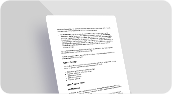 92 All enrolled eligible children will continue to be covered until the age limit listed in the Schedule of Benefits. Coverage may be continued past the age limit in the following circumstance: • For those already enrolled Dependents who cannot work to support themselves due to mental, intellectual, or physical impairment. The Dependent’s impairment must start before the end of the period they would become ineligible for coverage. We must be informed of the Dependent’s eligibility for continuation of coverage within 120 days after the Dependent would normally become ineligible. You must then give proof as often as we require. This will not be more often than once a year after the two-year period following the child reaching the limiting age. You must give the proof at no cost to us. You must notify us if the Dependent’s marital status changes and they are no longer eligible for continued coverage. You may be required to give proof of continued eligibility for any enrolled child. Your failure to give this information could result in termination of a child’s coverage. To obtain coverage for children, you may be required to give us a copy of any legal documents awarding guardianship of such child(ren) to you. Types of Coverage Your Employer offers the enrollment options listed below. After reviewing the available options, you may choose the option that best meets your needs. The options are as follows: • Subscriber only (also referred to as single coverage); • Subscriber and spouse; or Domestic Partner; • Subscriber and one child; • Subscriber and children; • Subscriber and family. When You Can Enroll Initial Enrollment The Employer will offer an initial enrollment period to new Subscribers and their Dependents when the Subscriber is first eligible for coverage. Coverage will be effective based on the waiting period chosen by the Employer, and will not exceed 90 days. If you did not enroll yourself and/or your Dependents during the initial enrollment period you will only be able to enroll during an Open Enrollment period or during a Special Enrollment period, as described below. Open Enrollment Open Enrollment refers to a period of time, usually 60 days, during which eligible Subscribers and Dependents can apply for or change coverage. Open Enrollment occurs only once per year. The Employer will notify you when Open Enrollment is available. Special Enrollment Periods If a Subscriber or Dependent does not apply for coverage when they were first eligible, they may be able to join the Plan prior to Open Enrollment if they qualify for Special Enrollment. Except as noted otherwise below, the Subscriber or Dependent must request Special Enrollment within 31 days of a qualifying event.