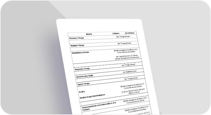 23 Benefits In-Network Out-of-Network Pulmonary Therapy See “Therapy Services.” Radiation Therapy See “Therapy Services.” Rehabilitation Services Benefits are based on the setting in which Covered Services are received. See “Inpatient Services” and “Therapy Services” for details on Benefit Maximums. Respiratory Therapy See “Therapy Services.” Skilled Nursing Facility See “Inpatient Services.” Speech Therapy See “Therapy Services.” Surgery Benefits are based on the setting in which Covered Services are received. Bariatric Surgery Benefit Maximum $1,000 per Benefit Period In- and Out-of- Network combined Temporomandibular and Craniomandibular Joint Treatment Benefits are based on the setting in which Covered Services are received. Therapy Services Benefits are based on the setting in which Covered Services are received. Benefit Maximum(s): Benefit Maximum(s) are for In- and Out-of- Network visits combined, and for office and outpatient visits combined. • Physical Therapy 20 visits per Benefit Period • Occupational Therapy 20 visits per Benefit Period • Speech Therapy 20 visits per Benefit Period • Manipulation Therapy 20 visits per Benefit Period • Cardiac Rehabilitation Unlimited • Pulmonary Rehabilitation Unlimited