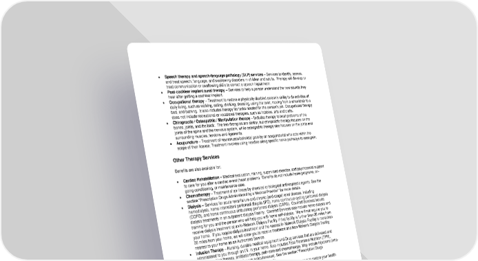 58 • Speech therapy and speech-language pathology (SLP) services – Services to identify, assess, and treat speech, language, and swallowing disorders in children and adults. Therapy will develop or treat communication or swallowing skills to correct a speech impairment. • Post-cochlear implant aural therapy – Services to help a person understand the new sounds they hear after getting a cochlear implant. • Occupational therapy – Treatment to restore a physically disabled person’s ability to do activities of daily living, such as walking, eating, drinking, dressing, using the toilet, moving from a wheelchair to a bed, and bathing. It also includes therapy for tasks needed for the person’s job. Occupational therapy does not include recreational or vocational therapies, such as hobbies, arts and crafts. • Chiropractic / Osteopathic / Manipulation therapy – Includes therapy to treat problems of the bones, joints, and the back. The two therapies are similar, but chiropractic therapy focuses on the joints of the spine and the nervous system, while osteopathic therapy also focuses on the joints and surrounding muscles, tendons and ligaments. • Acupuncture – Treatment of neuromusculoskeletal pain by an acupuncturist who acts within the scope of their license. Treatment involves using needles along specific nerve pathways to ease pain. Other Therapy Services Benefits are also available for: • Cardiac Rehabilitation – Medical evaluation, training, supervised exercise, and psychosocial support to care for you after a cardiac event (heart problem). Benefits do not include home programs, on- going conditioning, or maintenance care. • Chemotherapy – Treatment of an illness by chemical or biological antineoplastic agents. See the section “Prescription Drugs Administered by a Medical Provider” for more details. • Dialysis – Services for acute renal failure and chronic (end-stage) renal disease, including hemodialysis, home intermittent peritoneal dialysis (IPD), home continuous cycling peritoneal dialysis (CCPD), and home continuous ambulatory peritoneal dialysis (CAPD). Covered Services include dialysis treatments in an outpatient dialysis Facility. Covered Services also include home dialysis and training for you and the person who will help you with home self-dialysis. We will not require you to receive dialysis treatment at an In-Network Dialysis Facility if that facility is further than 30 miles from your home. If you require dialysis treatment and the nearest In-Network Dialysis Facility is more than 30 miles from your home, we will allow you to receive treatment at a Non-Network Dialysis Facility nearest to your home as an Authorized Service. • Infusion Therapy – Nursing, durable medical equipment and Drug services that are delivered and administered to you through an I.V. in your home. Also includes Total Parenteral Nutrition (TPN), Enteral nutrition therapy, antibiotic therapy, pain care and chemotherapy. May include injections (intra- muscular, subcutaneous, continuous subcutaneous). See the section “Prescription Drugs Administered by a Medical Provider” for more details. • Pulmonary Rehabilitation – Includes outpatient short-term respiratory care to restore your health after an illness or injury. • Cognitive rehabilitation therapy – Medically Necessary cognitive rehabilitation, including therapy following a post-traumatic brain injury or cerebral vascular accident. • Radiation Therapy – Treatment of an illness by x-ray, radium, or radioactive isotopes. Covered Services include treatment (teletherapy, brachytherapy and intraoperative radiation, photon or high energy particle sources), materials and supplies needed, and treatment planning. • Respiratory Therapy – Includes the use of dry or moist gases in the lungs, nonpressurized inhalation treatment; intermittent positive pressure breathing treatment, air or oxygen, with or without nebulized medication, continuous positive pressure ventilation (CPAP); continuous negative pressure ventilation (CNP); chest percussion; therapeutic use of medical gases or Drugs in the form of aerosols, and equipment such as resuscitators, oxygen tents, and incentive spirometers; broncho-pulmonary drainage and breathing exercises.