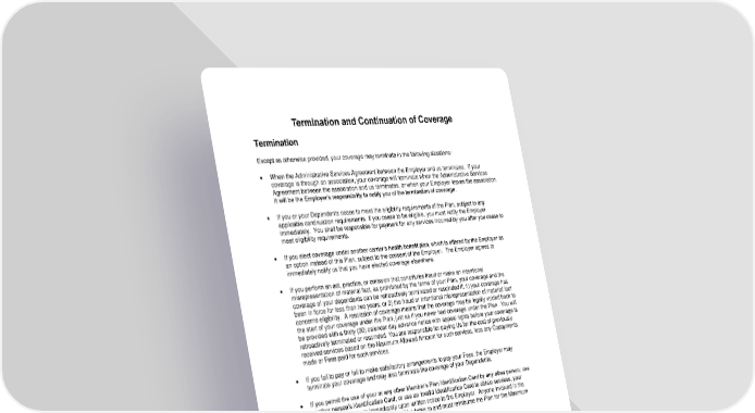 96 Termination and Continuation of Coverage Termination Except as otherwise provided, your coverage may terminate in the following situations: • When the Administrative Services Agreement between the Employer and us terminates. If your coverage is through an association, your coverage will terminate when the Administrative Services Agreement between the association and us terminates, or when your Employer leaves the association. It will be the Employer’s responsibility to notify you of the termination of coverage. • If you or your Dependents cease to meet the eligibility requirements of the Plan, subject to any applicable continuation requirements. If you cease to be eligible, you must notify the Employer immediately. You shall be responsible for payment for any services incurred by you after you cease to meet eligibility requirements. • If you elect coverage under another carrier’s health benefit plan, which is offered by the Employer as an option instead of this Plan, subject to the consent of the Employer. The Employer agrees to immediately notify us that you have elected coverage elsewhere. • If you perform an act, practice, or omission that constitutes fraud or make an intentional misrepresentation of material fact, as prohibited by the terms of your Plan, your coverage and the coverage of your dependents can be retroactively terminated or rescinded if: 1) your coverage has been in force for less than two years, or 2) the fraud or intentional misrepresentation of material fact concerns eligibility. A rescission of coverage means that the coverage may be legally voided back to the start of your coverage under the Plan, just as if you never had coverage under the Plan. You will be provided with a thirty (30) calendar day advance notice with appeal rights before your coverage is retroactively terminated or rescinded. You are responsible for paying Us for the cost of previously received services based on the Maximum Allowed Amount for such services, less any Copayments made or Fees paid for such services. • If you fail to pay or fail to make satisfactory arrangements to pay your Fees, the Employer may terminate your coverage and may also terminate the coverage of your Dependents. • If you permit the use of your or any other Member’s Plan Identification Card by any other person; use another person’s Identification Card; or use an invalid Identification Card to obtain services, your coverage will terminate immediately upon written notice to the Employer. Anyone involved in the misuse of a Plan Identification Card will be liable to and must reimburse the Plan for the Maximum Allowed Amount for services received through such misuse. You will be notified in writing of the date your coverage ends by either us or the Employer. Removal of Members Upon written request through the Employer, you may cancel your coverage and/or your Dependent’s coverage from the Plan. If this happens, no benefits will be provided for Covered Services after the termination date. Continuation of Coverage Under Federal Law (COBRA) The following applies if you are covered by an Employer that is subject to the requirements of the Consolidated Omnibus Budget Reconciliation Act (COBRA) of 1985, as amended.