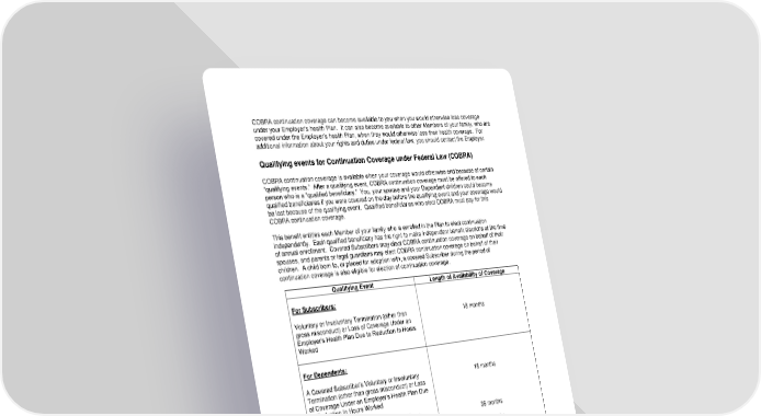 97 COBRA continuation coverage can become available to you when you would otherwise lose coverage under your Employer's health Plan. It can also become available to other Members of your family, who are covered under the Employer's health Plan, when they would otherwise lose their health coverage. For additional information about your rights and duties under federal law, you should contact the Employer. Qualifying events for Continuation Coverage under Federal Law (COBRA) COBRA continuation coverage is available when your coverage would otherwise end because of certain “qualifying events.” After a qualifying event, COBRA continuation coverage must be offered to each person who is a “qualified beneficiary.” You, your spouse and your Dependent children could become qualified beneficiaries if you were covered on the day before the qualifying event and your coverage would be lost because of the qualifying event. Qualified beneficiaries who elect COBRA must pay for this COBRA continuation coverage. This benefit entitles each Member of your family who is enrolled in the Plan to elect continuation independently. Each qualified beneficiary has the right to make independent benefit elections at the time of annual enrollment. Covered Subscribers may elect COBRA continuation coverage on behalf of their spouses, and parents or legal guardians may elect COBRA continuation coverage on behalf of their children. A child born to, or placed for adoption with, a covered Subscriber during the period of continuation coverage is also eligible for election of continuation coverage. Qualifying Event Length of Availability of Coverage For Subscribers: Voluntary or Involuntary Termination (other than gross misconduct) or Loss of Coverage Under an Employer’s Health Plan Due to Reduction In Hours Worked 18 months For Dependents: A Covered Subscriber’s Voluntary or Involuntary Termination (other than gross misconduct) or Loss of Coverage Under an Employer’s Health Plan Due to Reduction In Hours Worked Covered Subscriber’s Entitlement to Medicare Divorce or Legal Separation Death of a Covered Subscriber 18 months 36 months 36 months 36 months For Dependent Children: Loss of Dependent Child Status 36 months COBRA coverage will end before the end of the maximum continuation period listed above if you become entitled to Medicare benefits. In that case, a qualified beneficiary – other than the Medicare beneficiary – is entitled to continuation coverage for no more than a total of 36 months. (For example, if you become entitled to Medicare prior to termination of employment or reduction in hours, COBRA continuation coverage for your spouse and children can last up to 36 months after the date of Medicare entitlement.)