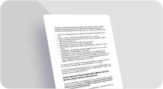 47 The services and supplies listed below are Covered Services when given by a Hospice for the palliative care of pain and other symptoms that are part of a terminal disease. Palliative care means care that controls pain and relieves symptoms but is not meant to cure a terminal illness. Covered Services include: • Care from an interdisciplinary team with the development and maintenance of an appropriate plan of care. • Short-term Inpatient Hospital care when needed in periods of crisis or as respite care. • Skilled nursing services, home health aide services, and homemaker services given by or under the supervision of a registered nurse. • Social services and counseling services from a licensed social worker. • Nutritional support such as intravenous feeding and feeding tubes. • Physical therapy, occupational therapy, speech therapy, and respiratory therapy given by a licensed therapist. • Pharmaceuticals, medical equipment, and supplies needed for the palliative care of your condition, including oxygen and related respiratory therapy supplies. • Bereavement (grief) services, including a review of the needs of the bereaved family and the development of a care plan to meet those needs, both before and after the Member’s death. Bereavement services are available to the patient and those individuals who are closely linked to the patient, including the immediate family, the primary or designated caregiver and individuals with significant personal ties, for one year after the Member’s death. Your Doctor must agree to care by the Hospice and must be consulted in the development of the care plan. The Hospice must keep a written care plan on file and give it to us upon request. Benefits for services beyond those listed above that are given for disease modification or palliation, such as but not limited to chemotherapy and radiation therapy, are available to a Member in Hospice. These services are covered under other parts of this Plan. Human Organ and Tissue Transplant (Bone Marrow / Stem Cell) Services, Cellular and Gene Therapy Services Your Plan includes coverage for Medically Necessary human organ and tissue transplants as well as certain cellular and gene therapies. To be eligible for coverage, we must approve the benefits in advance through Precertification and services must be performed by an approved In-Network Provider to be covered at the In-Network level. Certain transplants (e.g., cornea) are covered like any other surgery, under the regular inpatient and outpatient benefits described elsewhere in this Booklet. In this section you will see some key terms, which are defined below: Covered Procedure As decided by us, a Covered Procedure includes: • Any Medically Necessary human solid organ, tissue, and stem cell / bone marrow transplants and infusions, and • Any Medically Necessary cellular or other gene therapies, and • Any Medically Necessary acquisition procedures, mobilization, collection and storage. It also includes Medically Necessary myeloablative or reduced intensity preparative chemotherapy, radiation therapy, or a combination of these therapies,