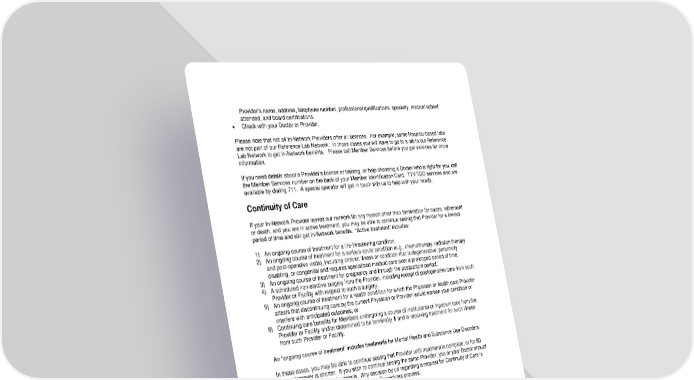 30 Provider’s name, address, telephone number, professional qualifications, specialty, medical school attended, and board certifications. • Check with your Doctor or Provider. Please note that not all In-Network Providers offer all services. For example, some Hospital-based labs are not part of our Reference Lab Network. In those cases you will have to go to a lab in our Reference Lab Network to get In-Network benefits. Please call Member Services before you get services for more information. If you need details about a Provider’s license or training, or help choosing a Doctor who is right for you, call the Member Services number on the back of your Member Identification Card. TTY/TDD services also are available by dialing 711. A special operator will get in touch with us to help with your needs. Continuity of Care If your In-Network Provider leaves our network for any reason other than termination for cause, retirement or death, and you are in active treatment, you may be able to continue seeing that Provider for a limited period of time and still get In-Network benefits. “Active treatment” includes: 1) An ongoing course of treatment for a life-threatening condition, 2) An ongoing course of treatment for a serious acute condition (e.g., chemotherapy, radiation therapy and post-operative visits), including chronic illness or condition that is degenerative, potentially disabling, or congenital and requires specialized medical care over a prolonged period of time, 3) An ongoing course of treatment for pregnancy and through the postpartum period, 4) A scheduled non-elective surgery from the Provider, including receipt of postoperative care from such Provider or Facility with respect to such a surgery, 5) An ongoing course of treatment for a health condition for which the Physician or health care Provider attests that discontinuing care by the current Physician or Provider would worsen your condition or interfere with anticipated outcomes, or 6) Continuing care benefits for Members undergoing a course of institutional or Inpatient care from the Provider or Facility and/or determined to be terminally ill and is receiving treatment for such illness from such Provider or Facility. An “ongoing course of treatment” includes treatments for Mental Health and Substance Use Disorders. In these cases, you may be able to continue seeing that Provider until treatment is complete, or for 90 days, whichever is shorter. If you wish to continue seeing the same Provider, you or your Doctor should contact Member Services for details. Any decision by us regarding a request for Continuity of Care is subject to the Grievance and External Review Procedures process. Your Cost-Shares Your Plan may involve Copayments, Deductibles, and/or Coinsurance, which are charges that you must pay when receiving Covered Services. Your Plan may also have an Out-of-Pocket Limit, which limits the cost-shares you must pay. Please read the “Schedule of Benefits” for details on your cost-shares. Also read the “Definitions” section for a better understanding of each type of cost share. Crediting Prior Plan Coverage If you were covered by the Employer’s prior carrier / plan immediately before the Employer signs up with us, with no break in coverage, then you will get credit for any accrued Deductible amounts under that other plan. This does not apply to people who were not covered by the prior carrier or plan on the day before the Employer’s coverage with us began, or to people who join the Employer later.