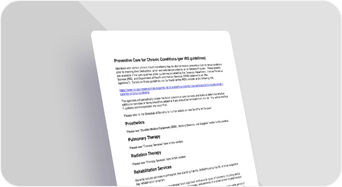 55 Preventive Care for Chronic Conditions (per IRS guidelines) Members with certain chronic health conditions may be able to receive preventive care for those conditions prior to meeting their Deductible, when services are provided by an In-Network Provider. These benefits are available if the care qualifies under guidelines provided by the Treasury Department, Internal Revenue Service (IRS), and Department of Health and Human Services (HHS) (referred to as “the agencies”). Details on those guidelines can be found on the IRS’s website at the following link: https://www.irs.gov/newsroom/irs-expands-list-of-preventive-care-for-hsa-participants-to-include-certain- care-for-chronic-conditions The agencies will periodically review the list of preventive care services and items to determine whether additional services or items should be added or if any should be removed from the list. You will be notified if updates are incorporated into your Plan. Please refer to the Schedule of Benefits for further details on how benefits will be paid. Prosthetics Please see “Durable Medical Equipment (DME), Medical Devices, and Supplies” earlier in this section. Pulmonary Therapy Please see “Therapy Services” later in this section. Radiation Therapy Please see “Therapy Services” later in this section. Rehabilitation Services Benefits include services in a Hospital, free-standing Facility, Skilled Nursing Facility, or in an outpatient day rehabilitation program. Covered Services involve a coordinated team approach and several types of treatment, including skilled nursing care, physical, occupational, and speech therapy, and services of a social worker or psychologist. To be Covered Services, rehabilitation services must involve goals you can reach in a reasonable period of time. Benefits will end when treatment is no longer Medically Necessary and you stop progressing toward those goals. Respiratory Therapy Please see “Therapy Services” later in this section. Skilled Nursing Facility When you require Inpatient skilled nursing and related services for convalescent and rehabilitative care, Covered Services are available if the Facility is licensed or certified under state law as a Skilled Nursing Facility. Custodial Care is not a Covered Service.