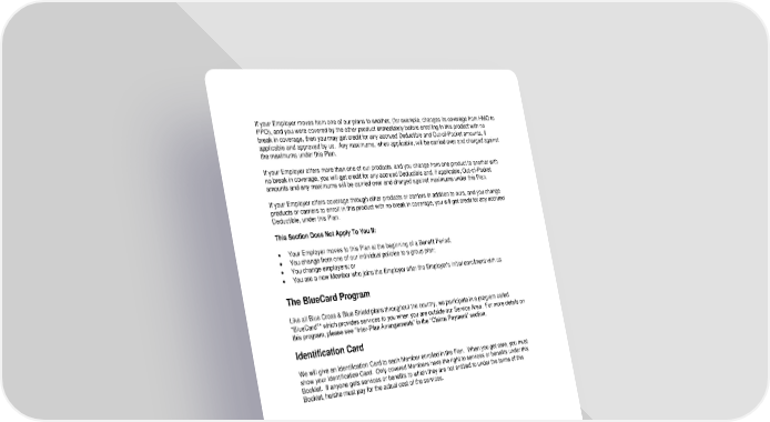 31 If your Employer moves from one of our plans to another, (for example, changes its coverage from HMO to PPO), and you were covered by the other product immediately before enrolling in this product with no break in coverage, then you may get credit for any accrued Deductible and Out-of-Pocket amounts, if applicable and approved by us. Any maximums, when applicable, will be carried over and charged against the maximums under this Plan. If your Employer offers more than one of our products, and you change from one product to another with no break in coverage, you will get credit for any accrued Deductible and, if applicable, Out-of-Pocket amounts and any maximums will be carried over and charged against maximums under this Plan. If your Employer offers coverage through other products or carriers in addition to ours, and you change products or carriers to enroll in this product with no break in coverage, you will get credit for any accrued Deductible, under this Plan. This Section Does Not Apply To You If: • Your Employer moves to this Plan at the beginning of a Benefit Period; • You change from one of our individual policies to a group plan; • You change employers; or • You are a new Member who joins the Employer after the Employer's initial enrollment with us. The BlueCard Program Like all Blue Cross & Blue Shield plans throughout the country, we participate in a program called "BlueCard" which provides services to you when you are outside our Service Area. For more details on this program, please see “Inter-Plan Arrangements” in the “Claims Payment” section. Identification Card We will give an Identification Card to each Member enrolled in the Plan. When you get care, you must show your Identification Card. Only covered Members have the right to services or benefits under this Booklet. If anyone gets services or benefits to which they are not entitled to under the terms of this Booklet, he/she must pay for the actual cost of the services.